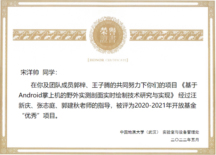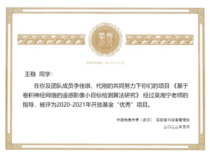 (通讯员:黄燕霞)近日,从实验室与设备管理处获悉,kaiyun在2020-2021学年度教学实验室开放基金项目验收评审中荣获佳绩。张志庭、郭建秋指导的学生团队项目《基于Android掌上机的野外实测剖面实时绘制技术研究与实现》(学生负责人:宋洋帅)、吴湘宁老师指导的项目《基于卷积神经网络的遥感影像小目标检测算法研究》(学生负责人:王稳),在考评中获评优秀,同时kaiyun开云官方被评为优秀项目管理单位。