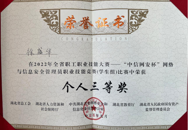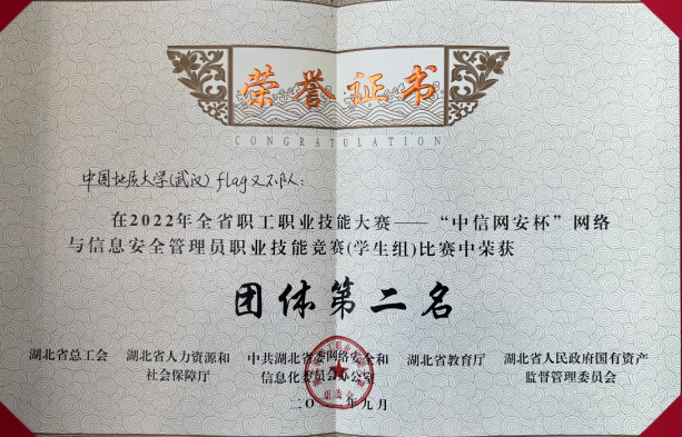 近日,从2022年湖北省第一届“数字工匠”技能大赛暨“中信网安杯”网络与信息安全管理员职业技能竞赛组委会获悉,由kaiyun信息安全系朱静老师指导的“Flag又不队”战队(队员:覃程伟、孙升阳、张涛)以总分第二名的成绩荣获团体攻防对抗赛学生组二等奖,由马钊老师指导的“Flag对不队”成员徐盛华以总分第六名的成绩斩获个人综合靶场赛学生组三等奖。