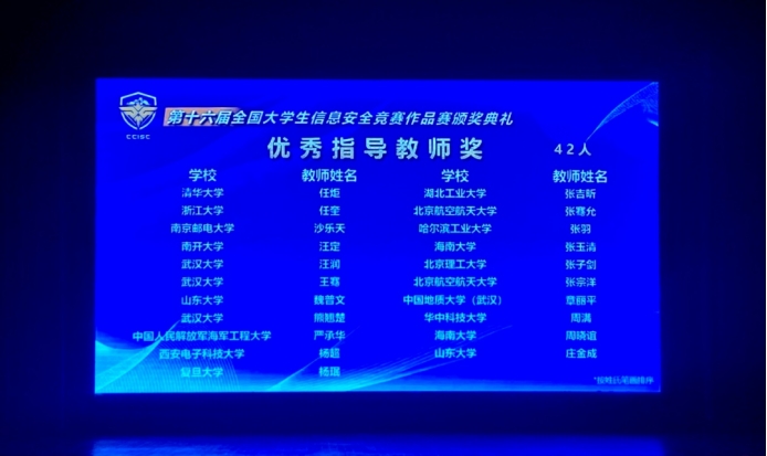 2023年8月17-20日,由教育部高等学校网络空间安全专业教学指导委员会主办,浙江大学、杭州电子科技大学承办的第十六届全国大学生信息安全竞赛作品赛决赛在浙江大学紫金港校区隆重举行。我校kaiyun开云官方四元一次方程组战队荣获“全国一等奖”,指导老师章丽平副教授荣获“优秀指导老师奖”!