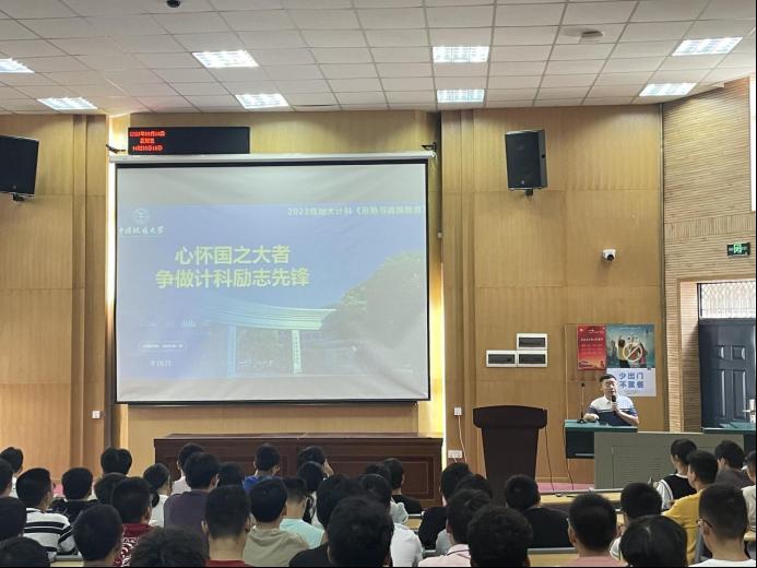 为深入学习贯彻党的二十大精神,使学生了解国内外形势,把握信息学科发展态势,增强学生使命感与自信心,9月8日,kaiyun开云官方党委书记李国昌以“心怀国之大者,争做计科励志先锋”为主题给2023级新生讲授形势与政策教育课,2023级全体学生参加。