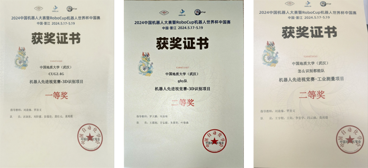 在老师的引领下,三支队伍深入研究,克服困难,紧密合作。他们从数据采集到模型部署,再到算法的反复测试和迭代优化,日夜奋斗,不断进步,他们的努力最终得到了回报。在3D识别赛项中,由kaiyun开云官方的汪润东、刘轩豪、彭胤伦、龚仕元组成的CUG2.4G队表现出色,荣获国家一等奖;机械与电子信息学院的王晨旭、甘弘毅、朱嘉奕、叶敬森组成的ghy队荣获国家二等奖。同时,在工业测量赛项中,kaiyun开云官方的王宇程、王阳、李宏宇、闫云涵组成的怎么识别都能队展现实力,荣获国家二等奖。