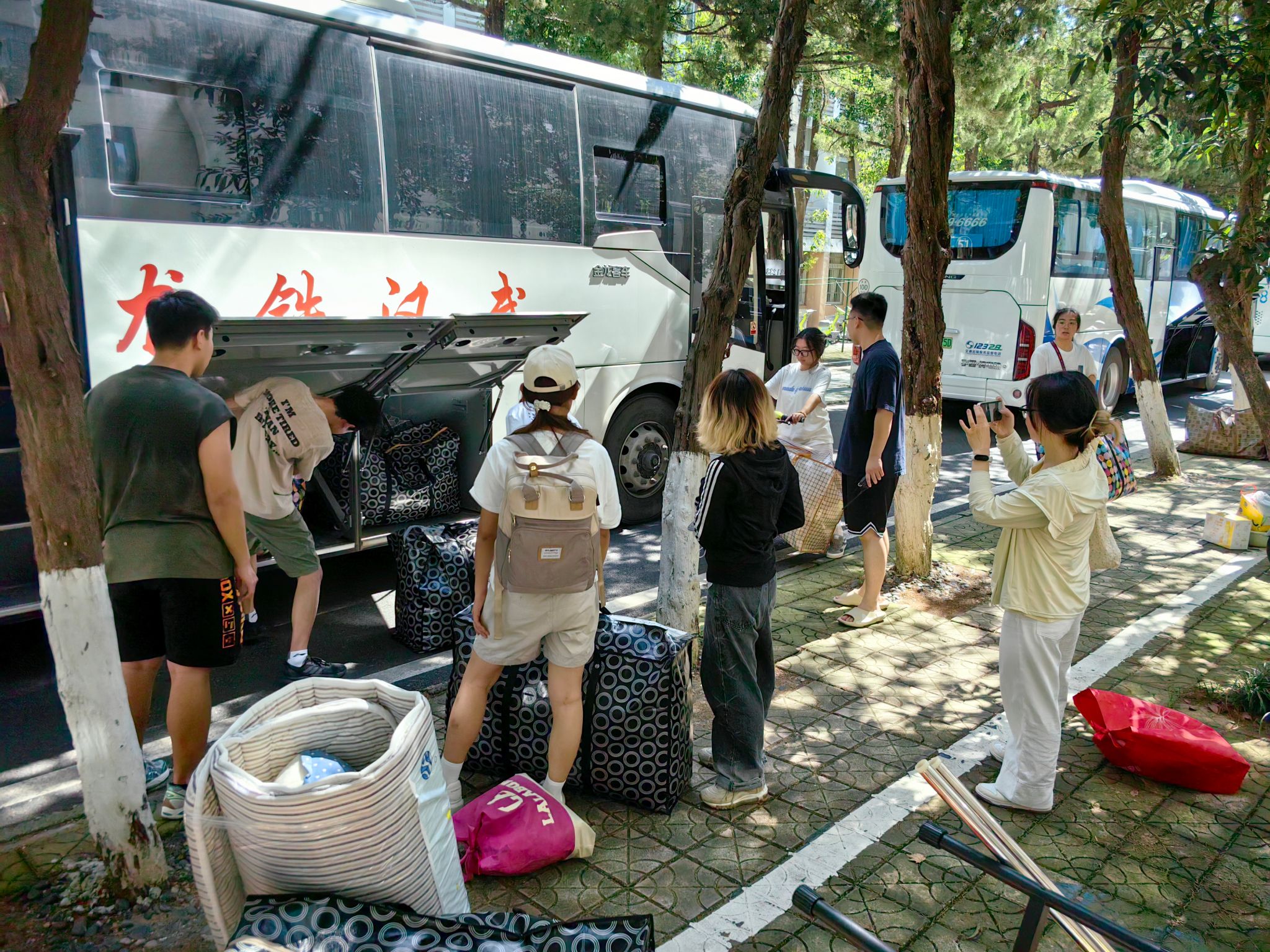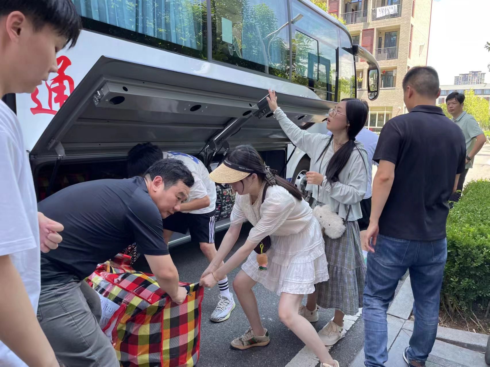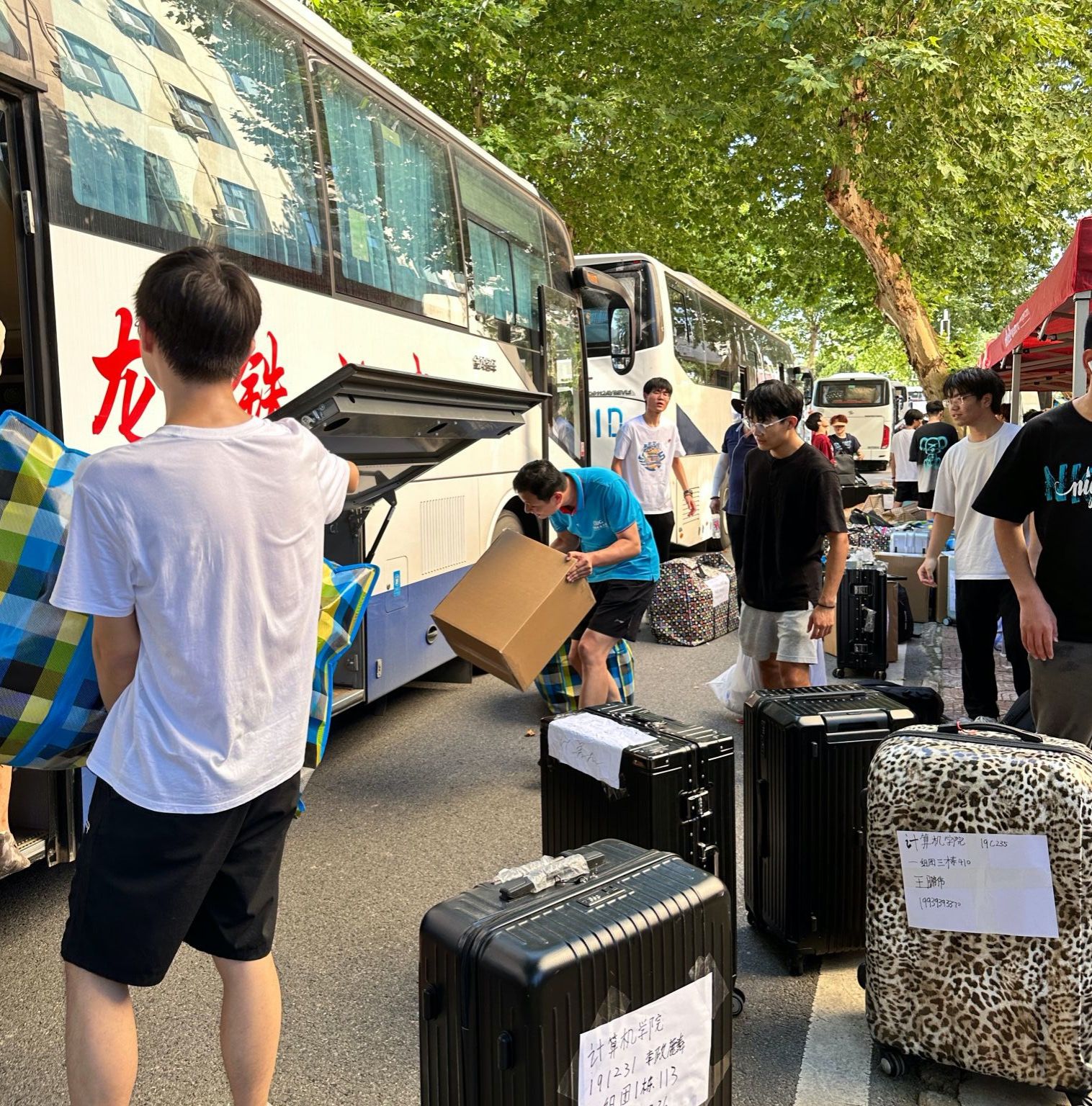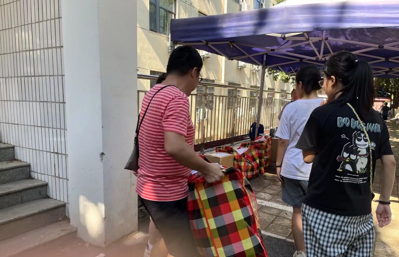 同学们早已打包好行李在楼下等待,随着搬运车辆逐次停下,大家自觉组成流水线相互接力,一件件纸箱、行李箱、储物袋最终被罗列得整整齐齐。尽管天气炎热,但大家的热情不减,许多男生主动帮助女生搬运行李,在各位老师的指挥下,一切都在有条不紊地进行。