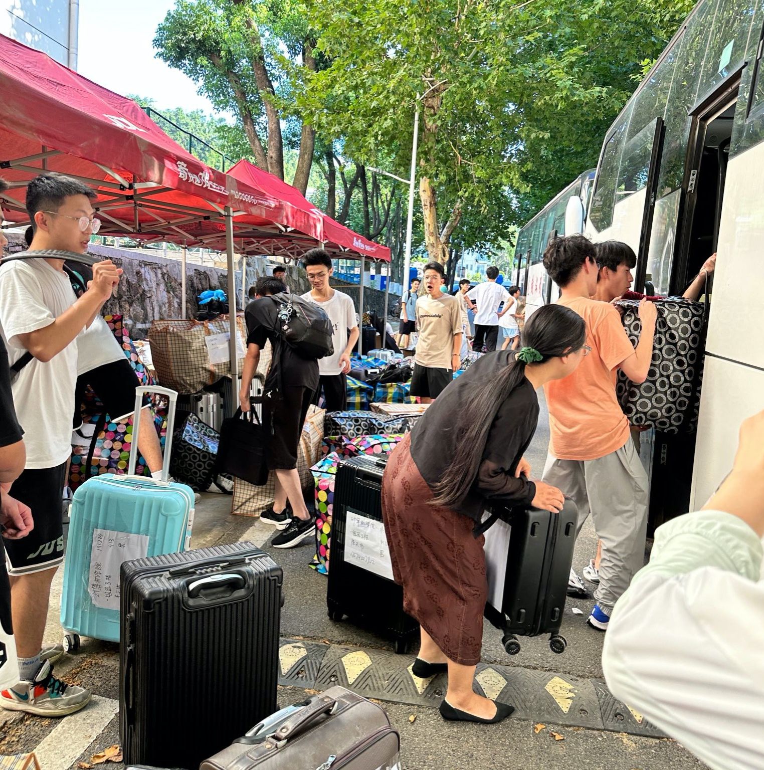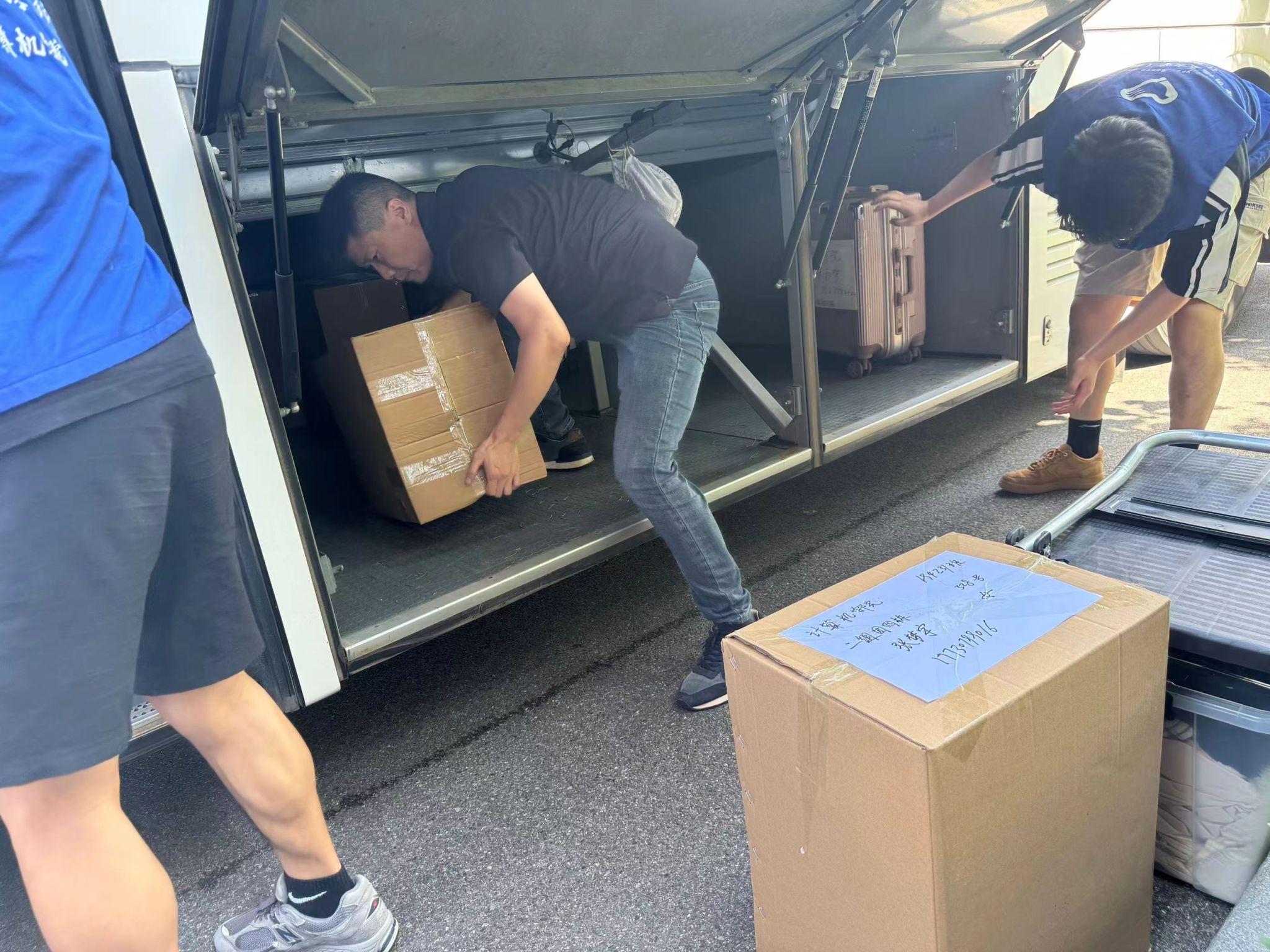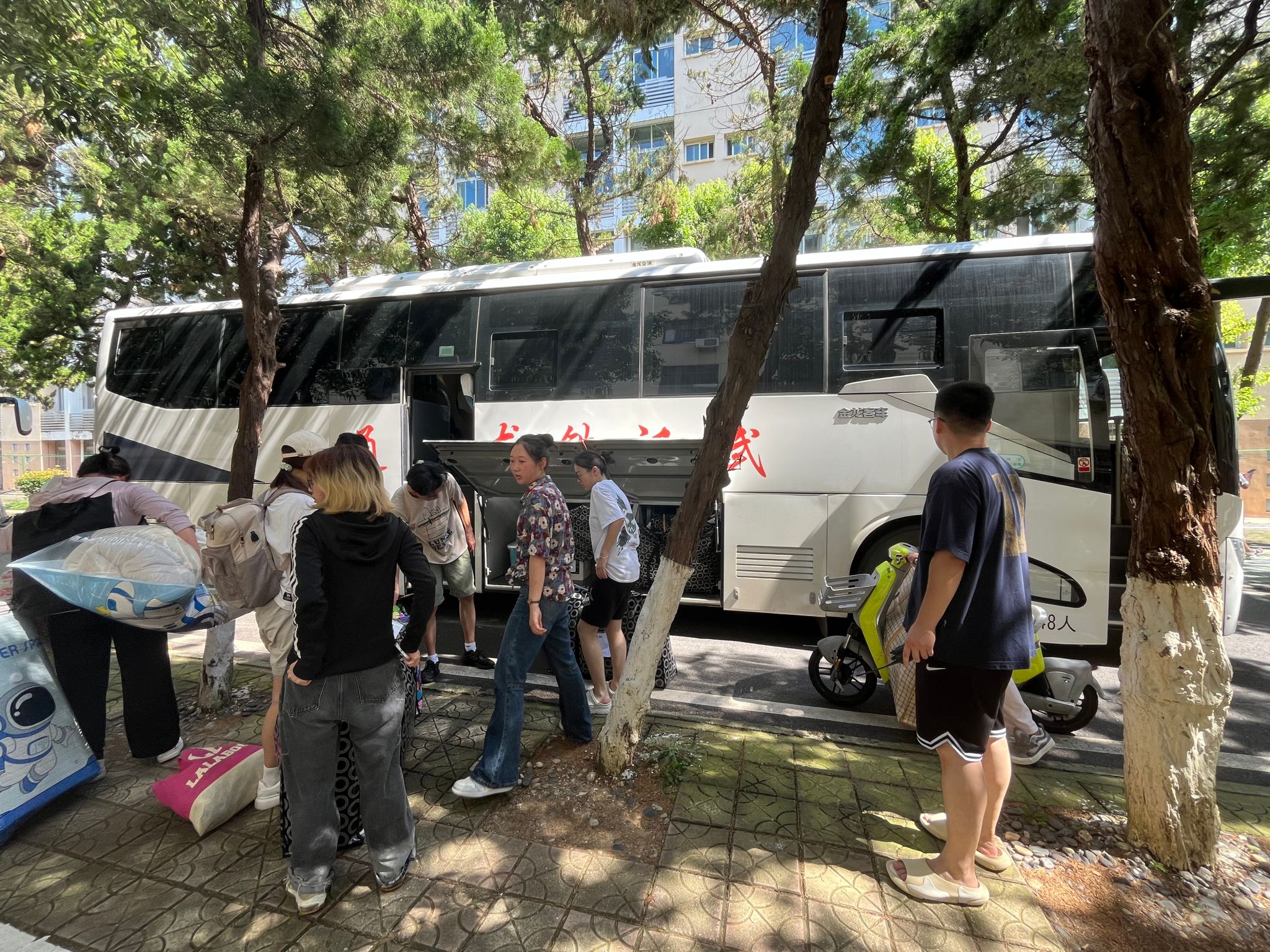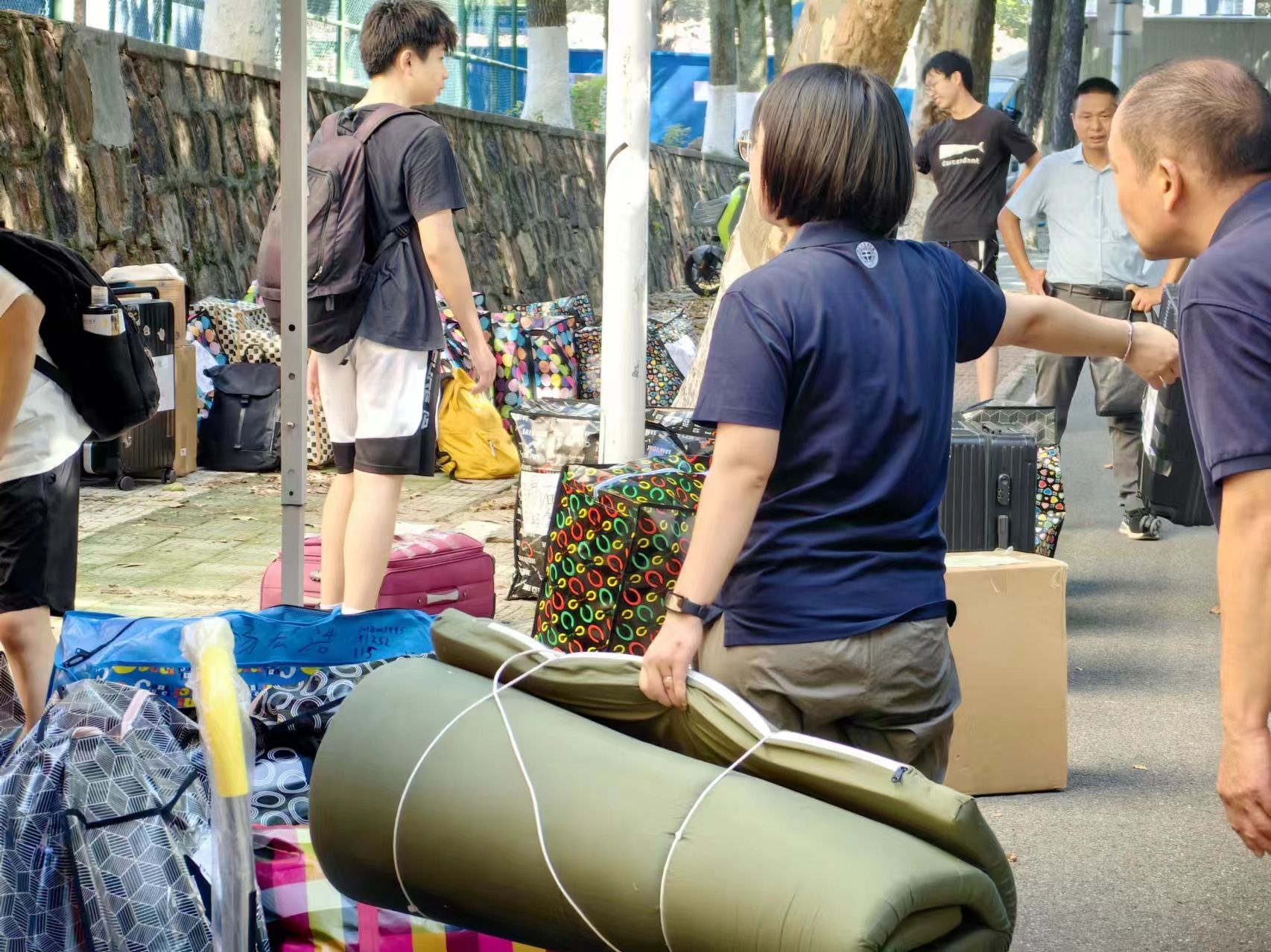 同学们早已打包好行李在楼下等待,随着搬运车辆逐次停下,大家自觉组成流水线相互接力,一件件纸箱、行李箱、储物袋最终被罗列得整整齐齐。尽管天气炎热,但大家的热情不减,许多男生主动帮助女生搬运行李,在各位老师的指挥下,一切都在有条不紊地进行。
