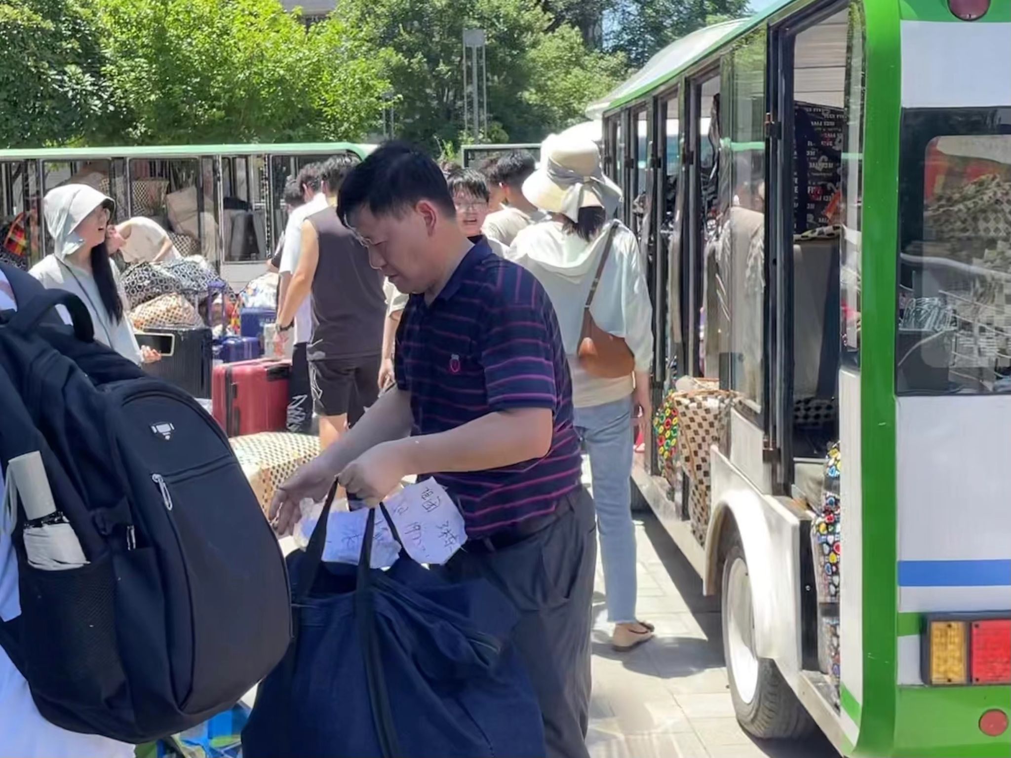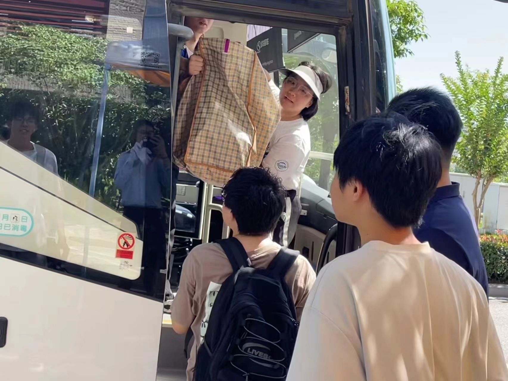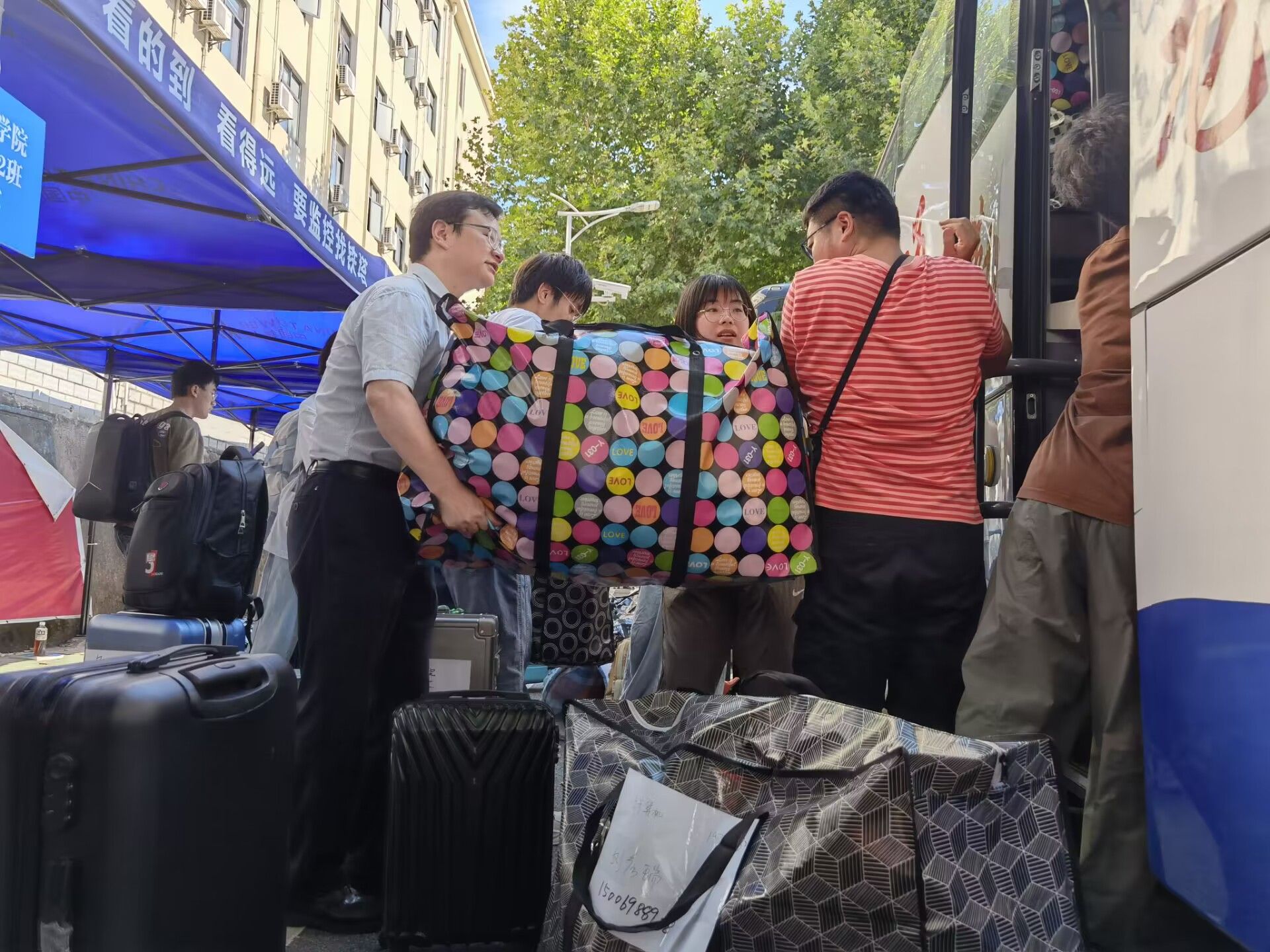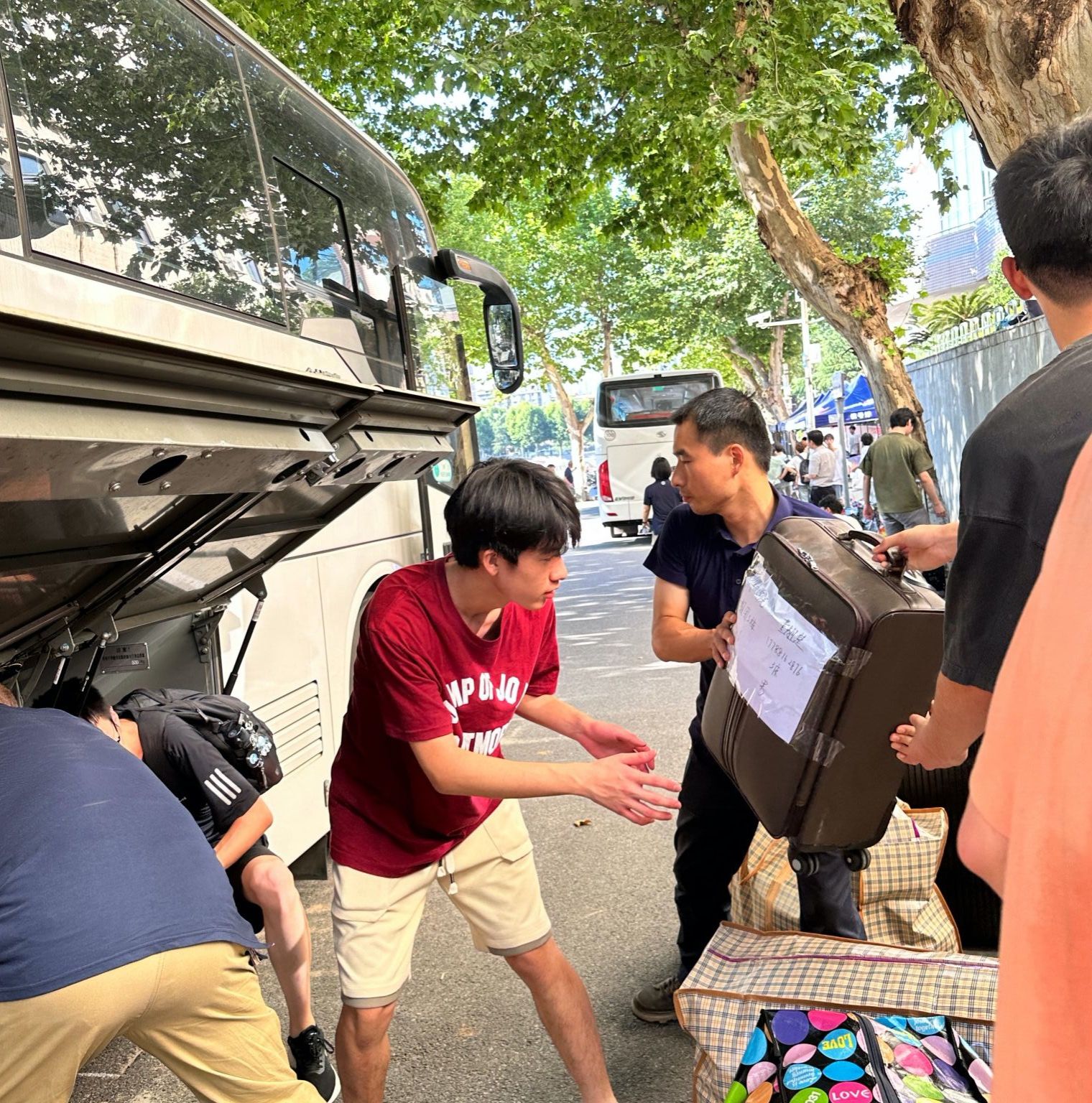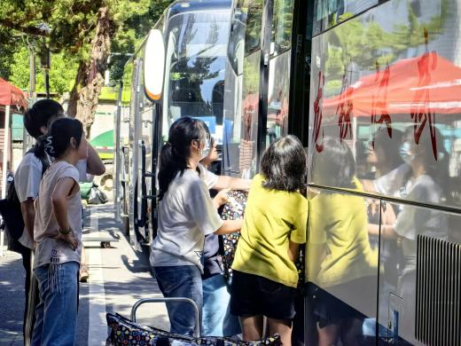 同学们早已打包好行李在楼下等待,随着搬运车辆逐次停下,大家自觉组成流水线相互接力,一件件纸箱、行李箱、储物袋最终被罗列得整整齐齐。尽管天气炎热,但大家的热情不减,许多男生主动帮助女生搬运行李,在各位老师的指挥下,一切都在有条不紊地进行。