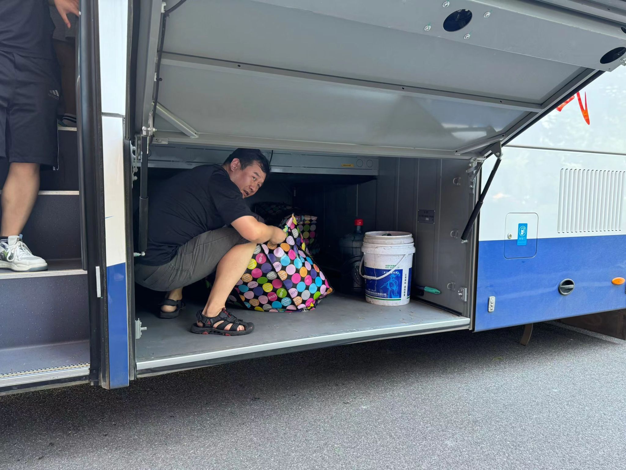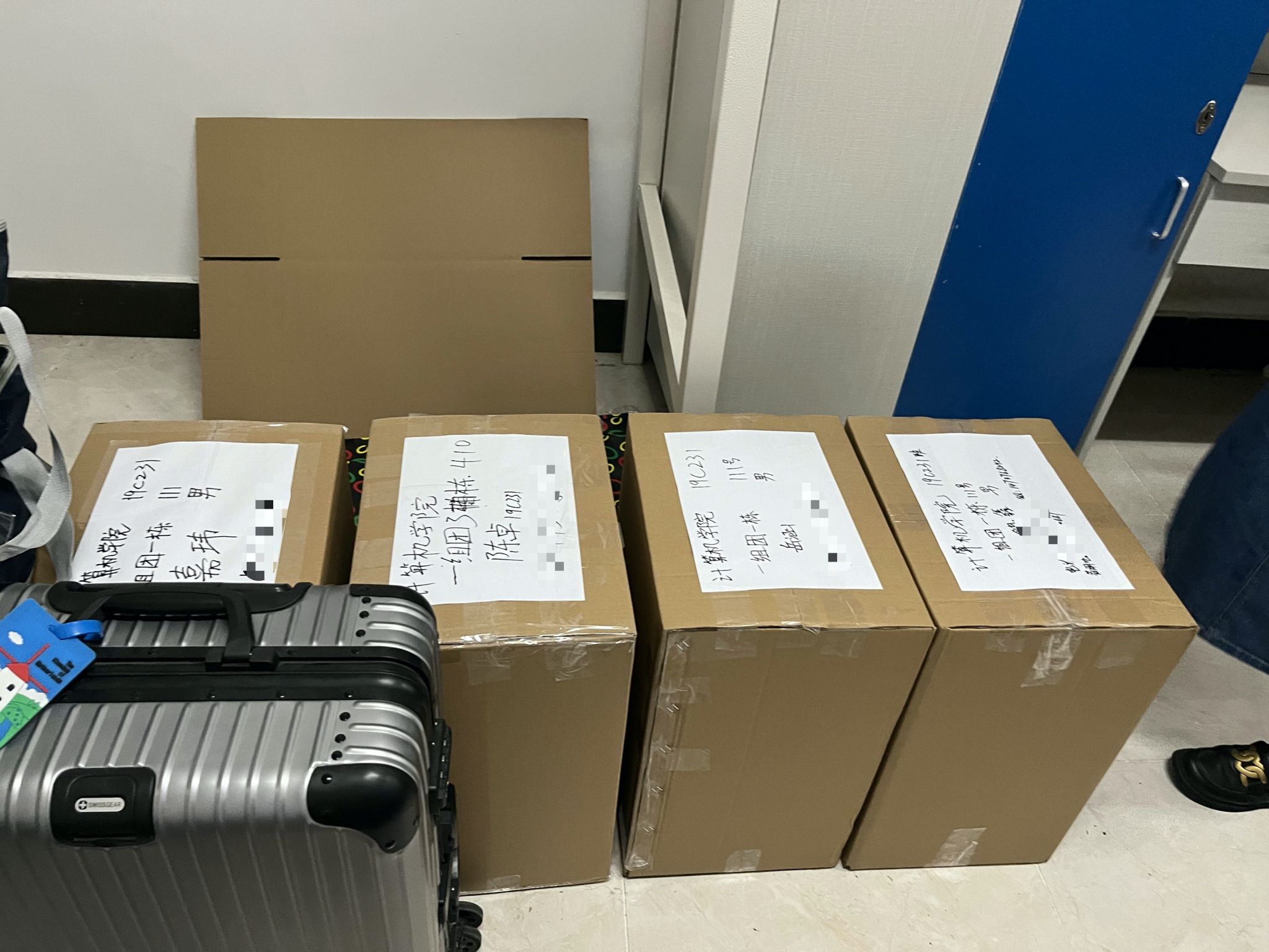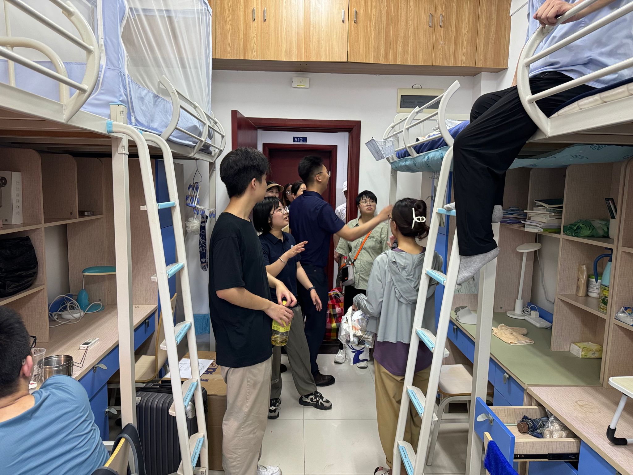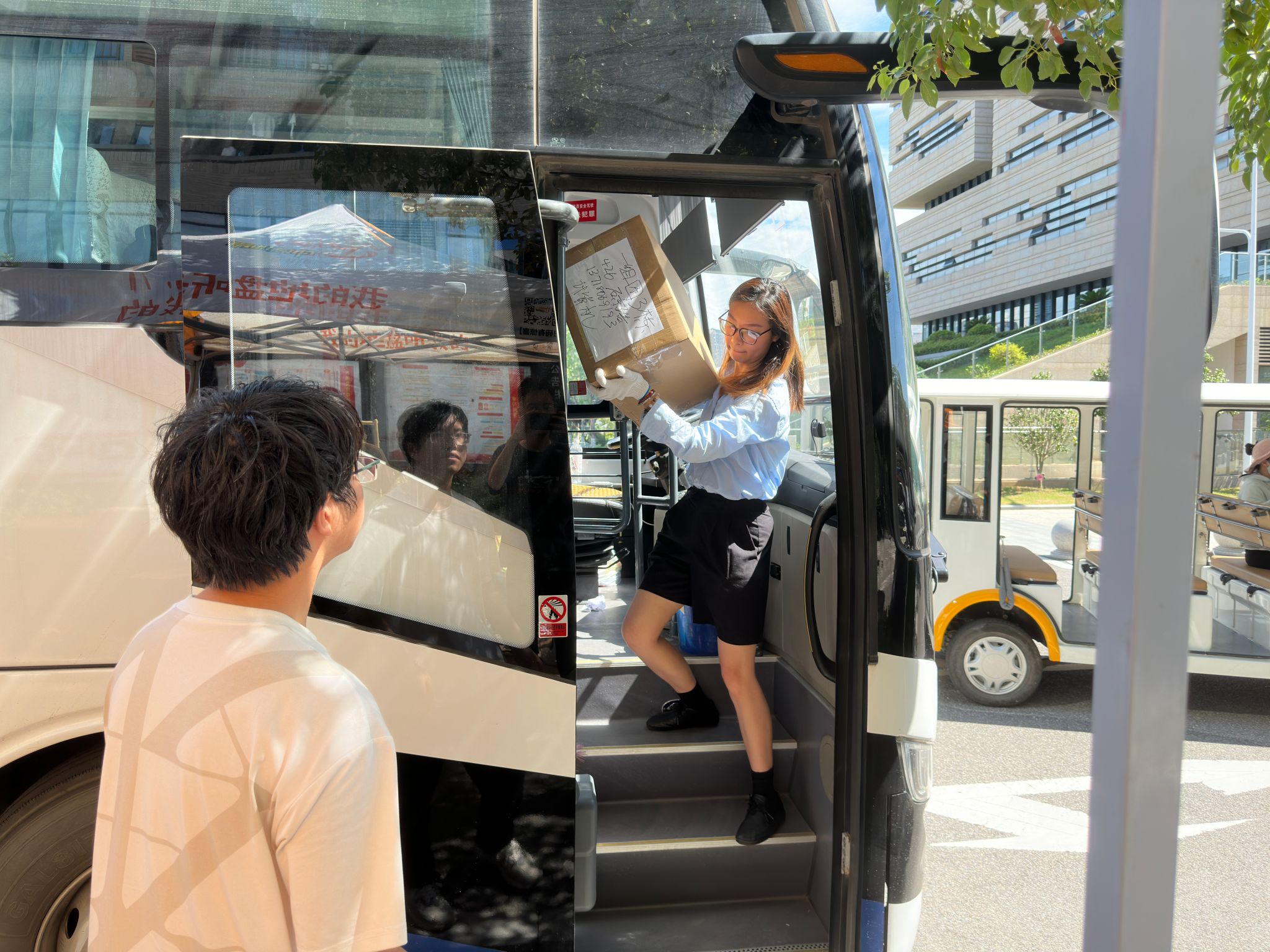 同学们早已打包好行李在楼下等待,随着搬运车辆逐次停下,大家自觉组成流水线相互接力,一件件纸箱、行李箱、储物袋最终被罗列得整整齐齐。尽管天气炎热,但大家的热情不减,许多男生主动帮助女生搬运行李,在各位老师的指挥下,一切都在有条不紊地进行。
