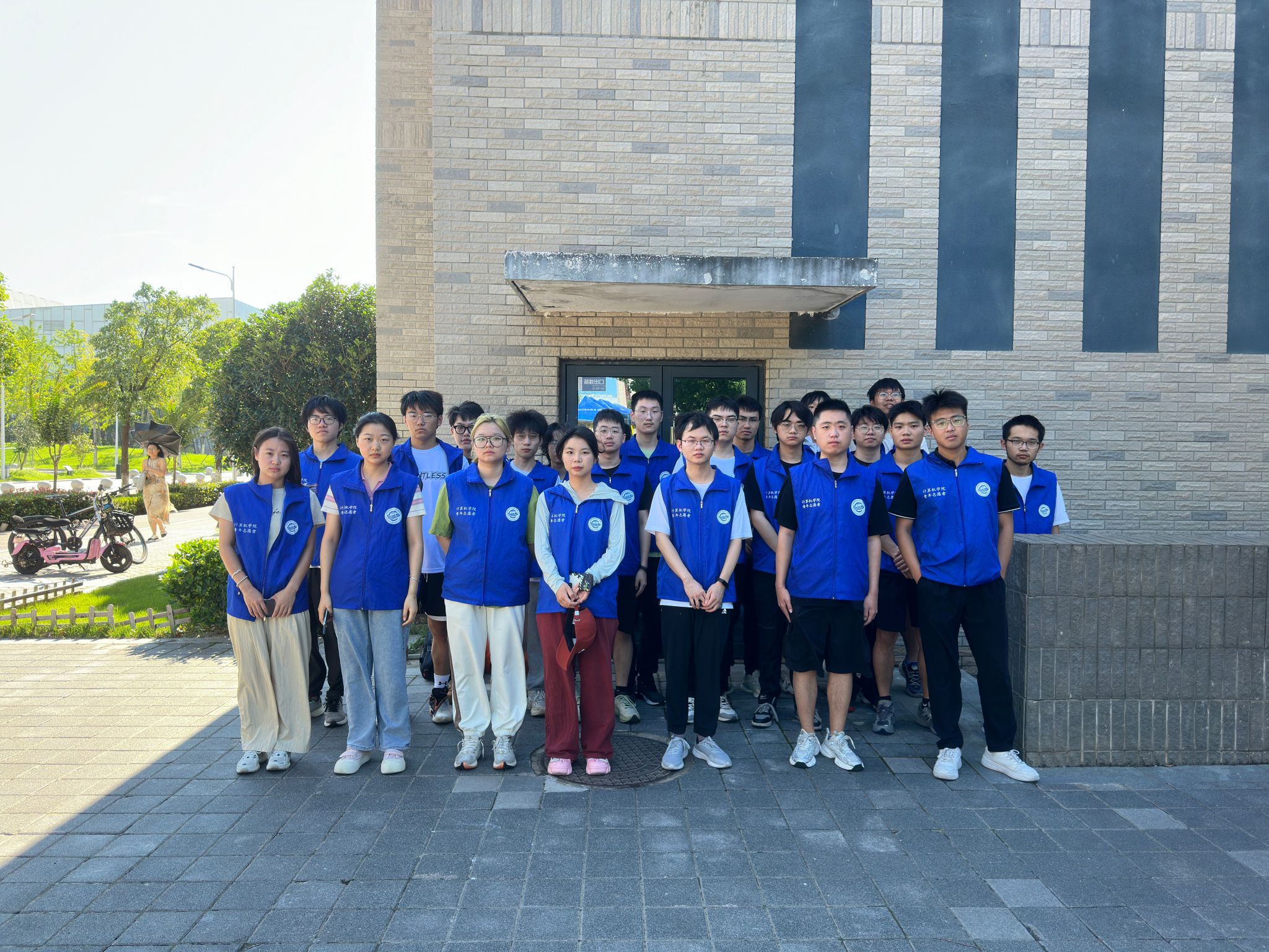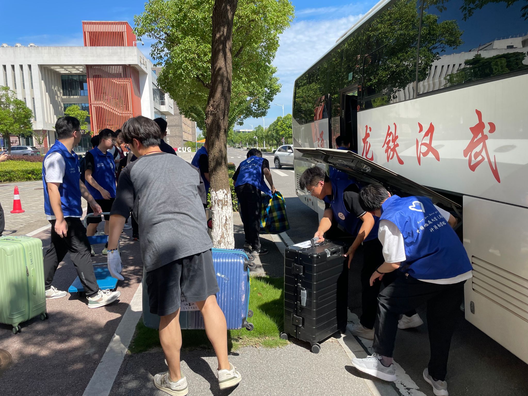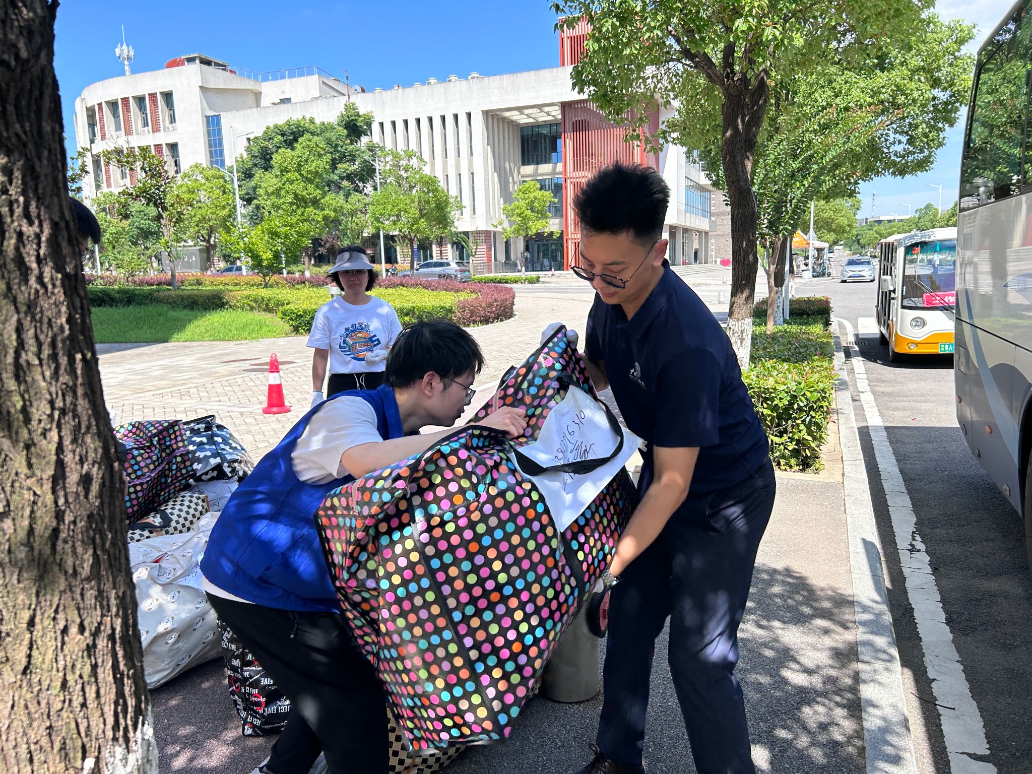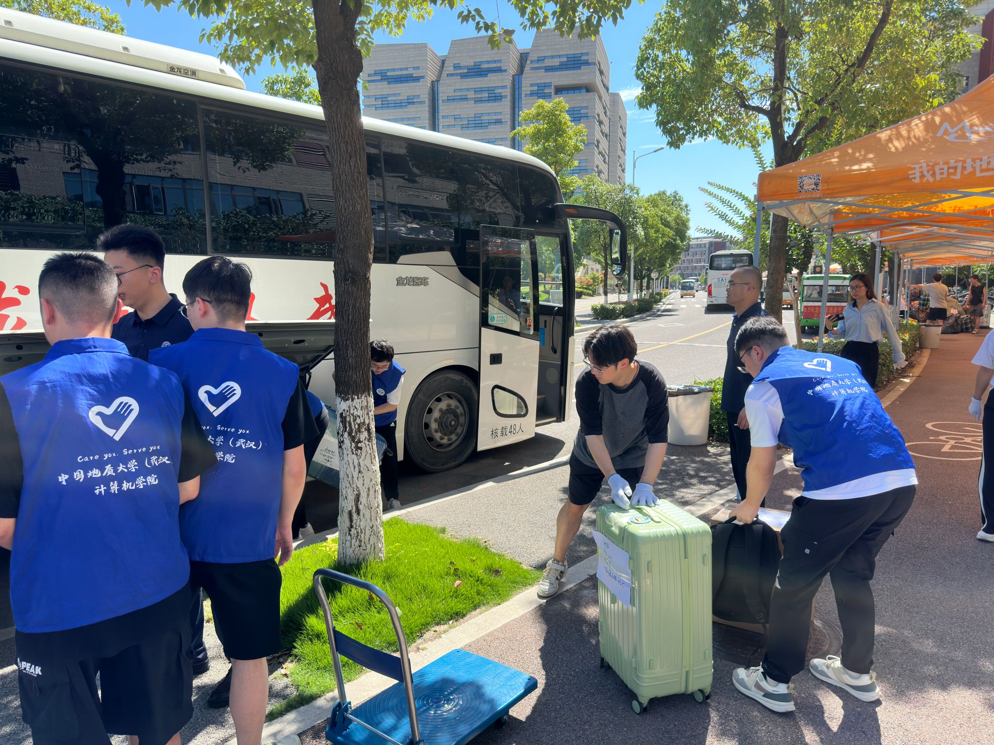 大巴驶入校园,在学生们即将入住的宿舍前,橙色的凉棚早早张开,身着蓝色马甲的志愿者们等候多时。多批运输车辆将学生物品运至宿舍楼下,老师和志愿者为新到来的2023级计科学子搬运行李,指明方向;宿管阿姨分发钥匙,严谨细致地录入信息;同学们彼此合作,将沉重的包裹运到新宿舍,开启一段崭新的未来旅程。