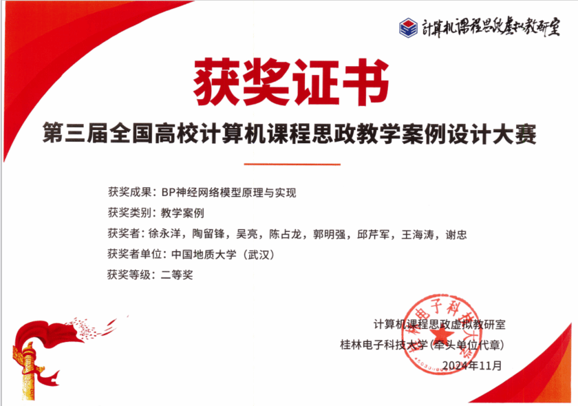 在学院党委的大力支持下,多位教师携其精心设计的教学案例参赛。其中,邱芹军等老师提交的“地质知识图谱的构建及推理应用”、李桂玲等老师提交的“最小生成树的Prim算法”获得一等奖,徐永洋等老师提交的“BP神经网络模型原理与实现”获得二等奖。以上荣誉的获得不仅展示了我校计算机科学与技术领域的教学水平,更体现了我校在人工智能赋能思政教育融入课程教学方面的显著成效。