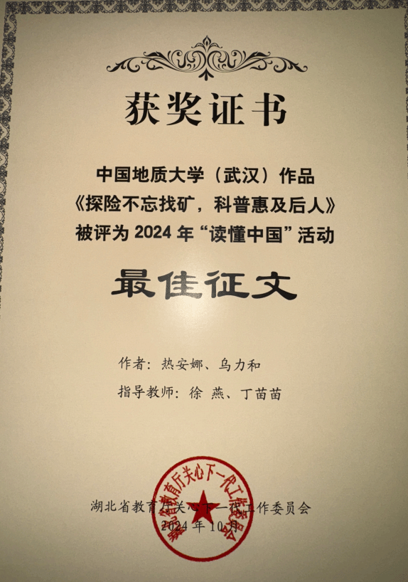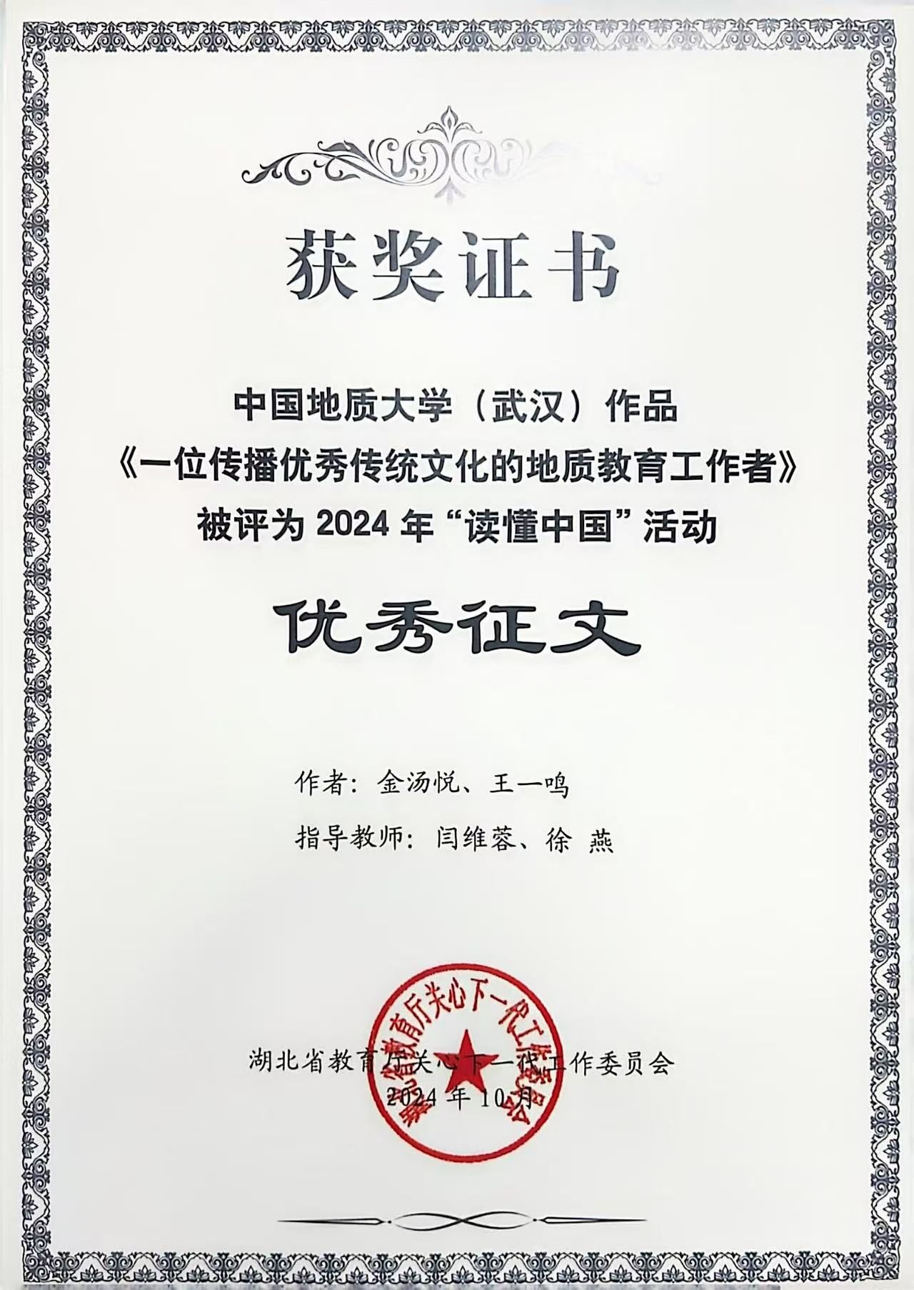 在征文赛道,由kaiyun热安娜、乌力和同学参与撰写的《探险不忘找矿,科普惠及后人》,以深邃的视角记述了费宣校友这位脚下是山河湖海、心中有星辰和梦想的地质人,获评湖北省2024年“读懂中国”活动最佳征文。由kaiyun闫维蓉、图书档案与文博部徐燕老师指导,金汤悦、王一鸣同学撰写的《一位传播优秀传统文化的地质教育工作者》以细腻的笔触勾勒出曾佐勋教授40余年教书育人、传播中华传统文化的动人故事,获评湖北省2024年“读懂中国”活动优秀征文。