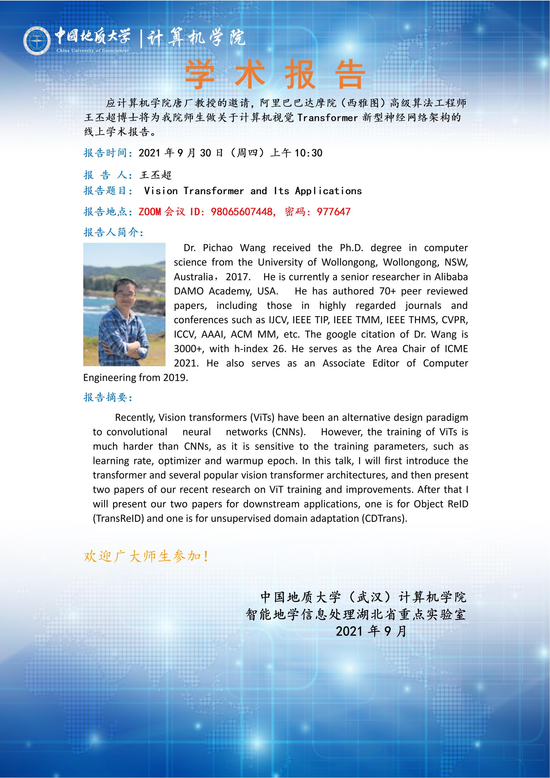 学术报告——阿里巴巴达摩院高级算法工程师王丕超:Vision Transformer and Its Applications