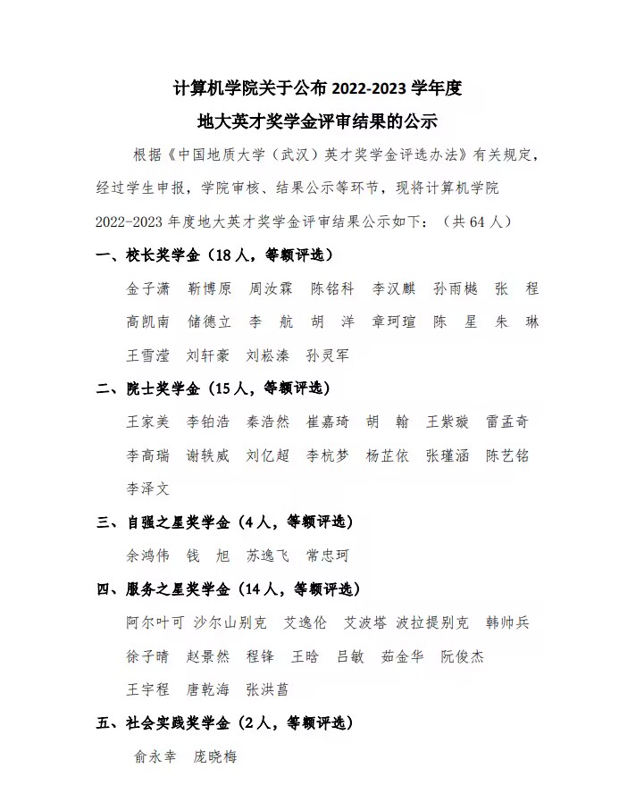kaiyun开云官方关于公布2022-2023学年度地大英才奖学金评审结果的公示