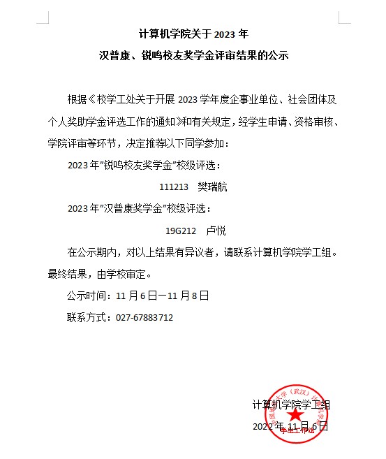 kaiyun开云官方关于2023学年汉普康、锐鸣校友奖学金评审结果的公示