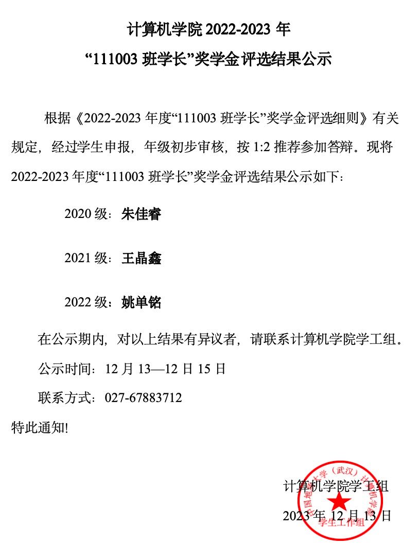 kaiyun开云官方2022-2023年 “111003班学长”奖学金评选结果公示