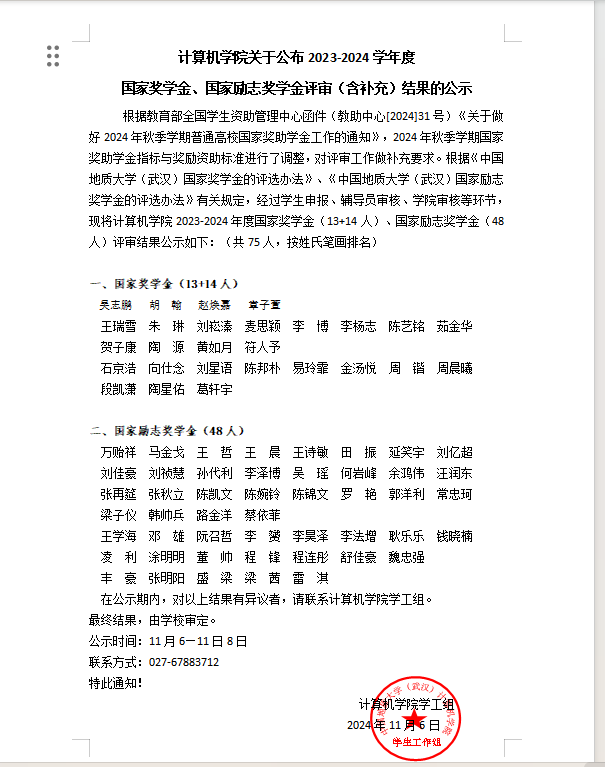kaiyun开云官方关于公布2023-2024学年度 国家奖学金、国家励志奖学金评审(含补充)结果的公示