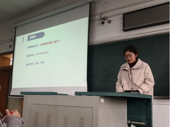 沈晨介绍年级管理和近期重点工作。他在进行简单的自我介绍后,从学院的日常管理、考风考纪、假期安排及重要事项提醒、假期要求等方面,提醒学生严格遵守学校各项规定,希望大家能够度过一个安全、充实、有意义的假期。
