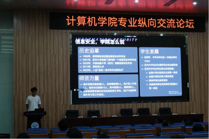 2019级信息安全专业本科生霍奥林结合专业材料从信息安全专业情况、学习课程、自身感受、就业形势四个方面向同学们进行详尽介绍,他认为无论选择哪个专业都要脚踏实地的努力。