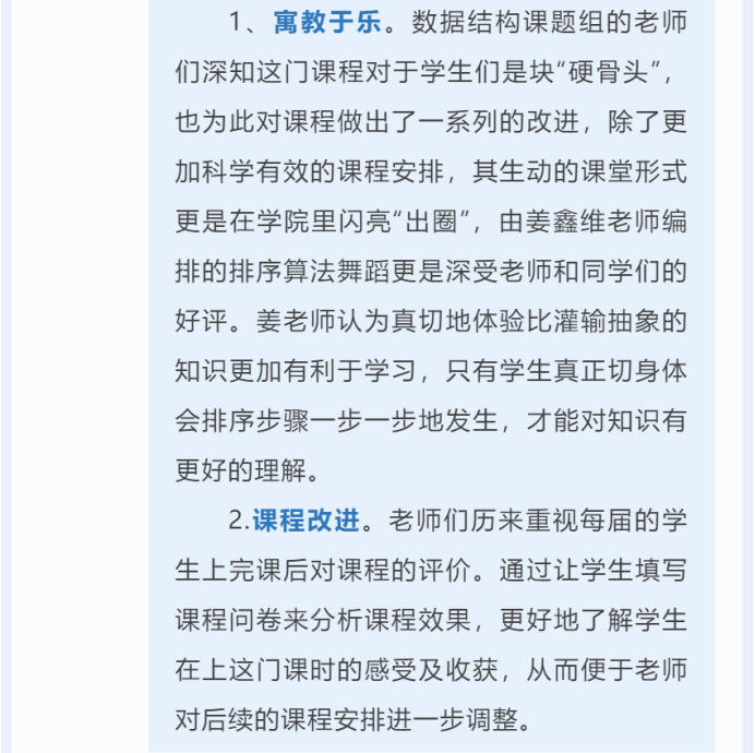 珍惜时光好好学习,掌握知识本领,树立专业报国的价值观,为解决“卡脖子”技术贡献自己的计科力量。kaiyun开云官方多年以来一以贯之的坚持做的一件事就是构建专业思政视域下的计科三全育人体系。紧抓育人“指挥棒”,直面育人“新挑战”,做强育人“合力军”,打造学科精神培育网。数据结构课题组的师生一起努力,共同铸造了这颗耸立于计算机科学海洋中的参天大树。在时间的洗礼和技术的涵养下,数据结构教学体系“枝繁叶茂”,在计算机科学的世界中不断精进!