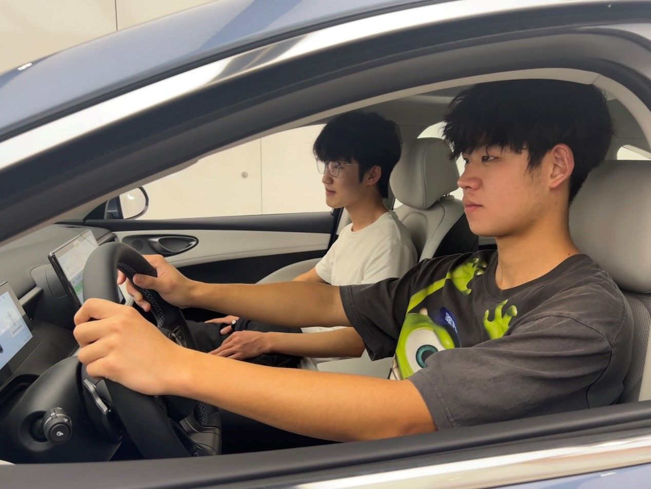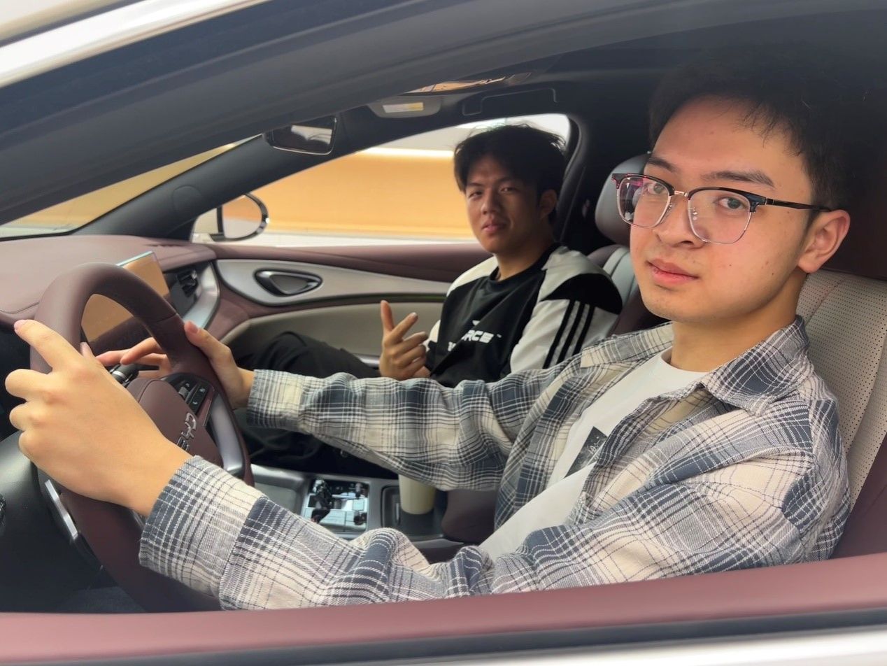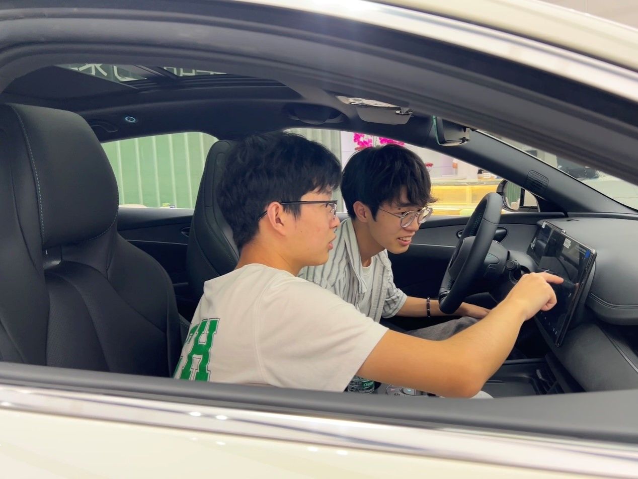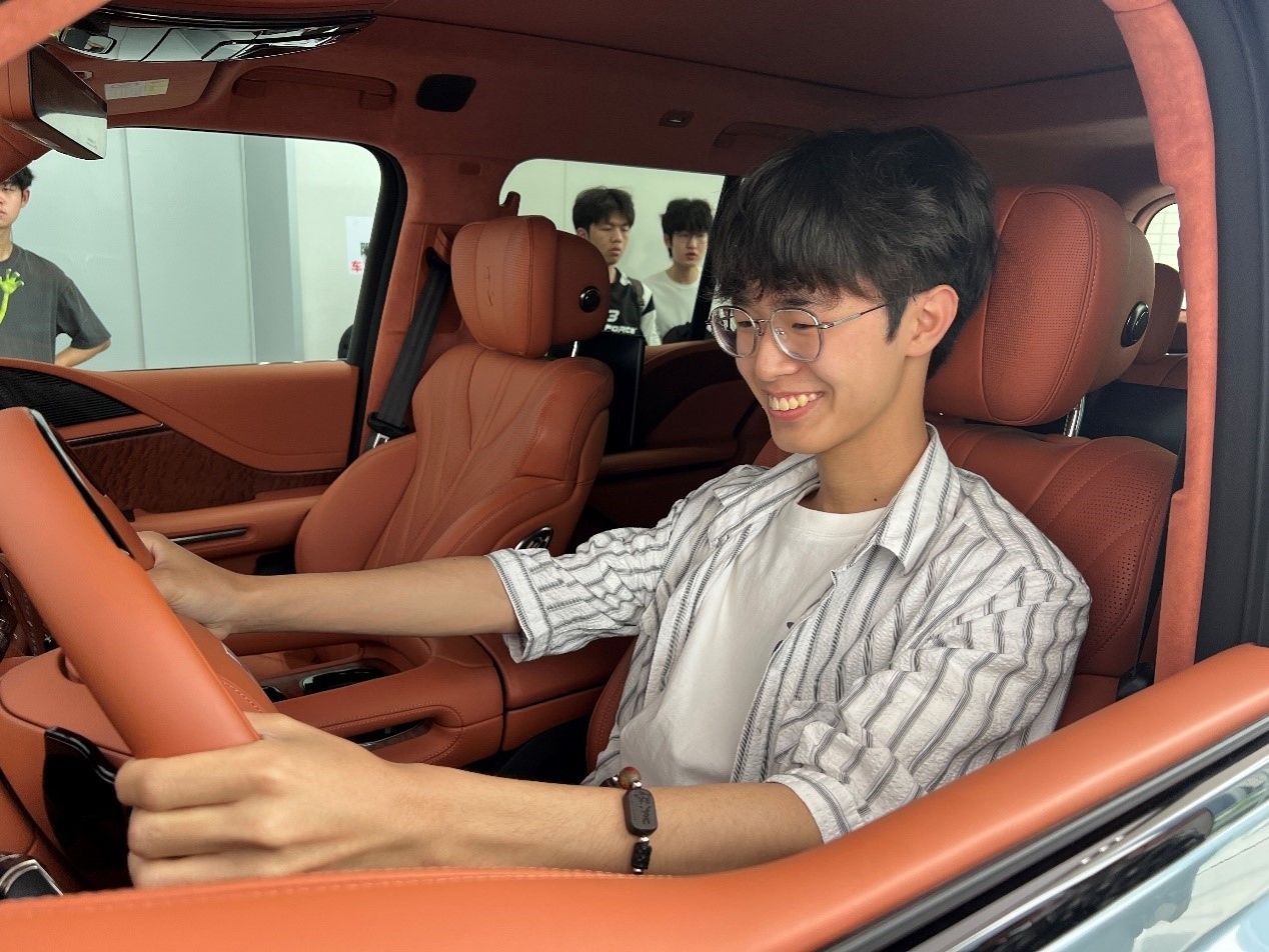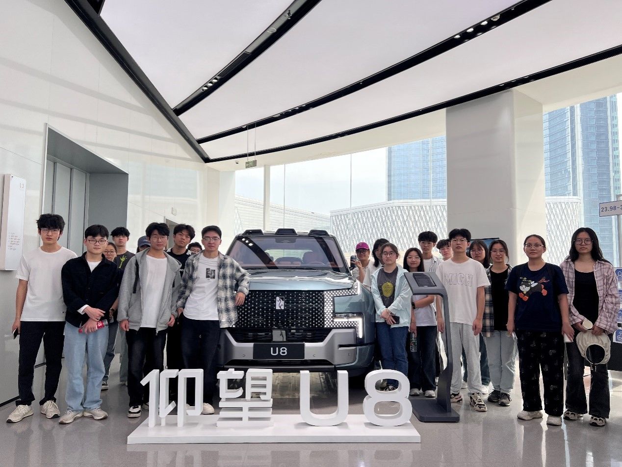 随后,同学们参观了比亚迪的车型展厅,涵盖比亚迪王朝系列、海洋系列,还有旗下品牌腾势、方程豹及仰望等多款热门、豪华车型。讲解员逐一介绍了各车型的特点,并邀请同学们上车试驾体验,感受不同车型的驾驶性能与智能科技配置,同学们兴致勃勃,纷纷上车操作。24级同学在试驾仰望u8车型时,对比亚迪的智能化座舱和动力表现赞不绝口,参观完比亚迪展厅后他表示“今天也算是坐上百万豪车了!”。