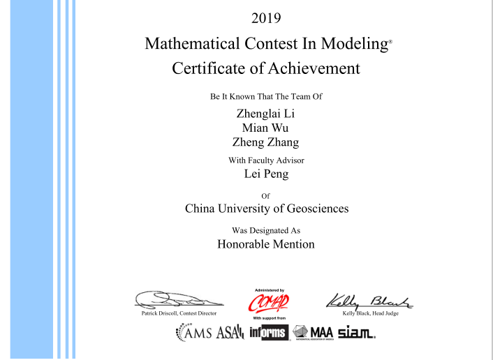 kaiyun研究生在2019年1月25日至29日为期四天的比赛时间中,沉着冷静,细心求证,就指定的问题顺利完成从建立模型、求解、验证到论文撰写的全部工作,获得Honorable Mention奖(二等奖)。