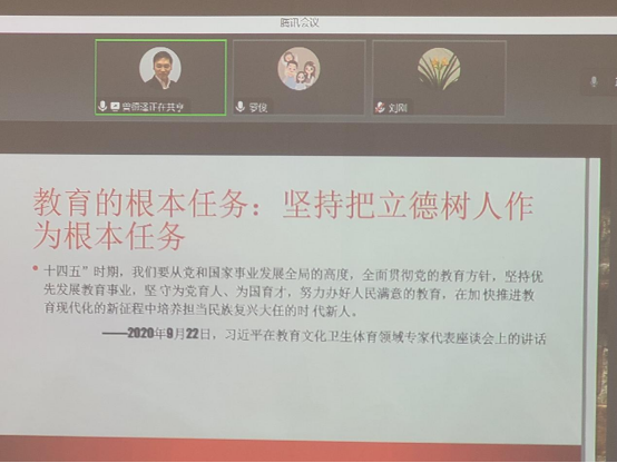 曾德泽副院长线上汇报的是《学习习近平总书记关于教育的重要论述,迈向中国教育现代化》。他从深刻洞悉全球发展大势,着力把握全球发展格局的背景,中国特色社会主义进入新时代,党和国家教育事业面临新任务、新要求,全面总结党和国家教育事业改革发展成就经验,着力破解现实问题等三个方面进行了学习分享,对坚持把立德树人作为根本任务、做人类文明的传承者等方面提出了建议意见。