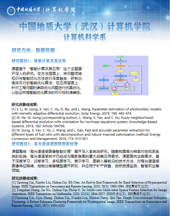 主要开展机器学习、演化算法及其智能调度应用、人工智能及其应用、高光谱图像处理等方面的科研工作。共有专任教师10人,其中学术带头人1人,学术骨干3人。主持的项目获湖北省自然科学二、三等奖各1次,获湖北省教学成果二、三等奖各1次。承担国家自然科学基金面上项目、国家自然科学基金青年科学基金项目、国家863计划专题课题、湖北省自然科学基金创新群体项目、湖北省自然科学基金面上项目、新疆国土资源厅项目等20余项。