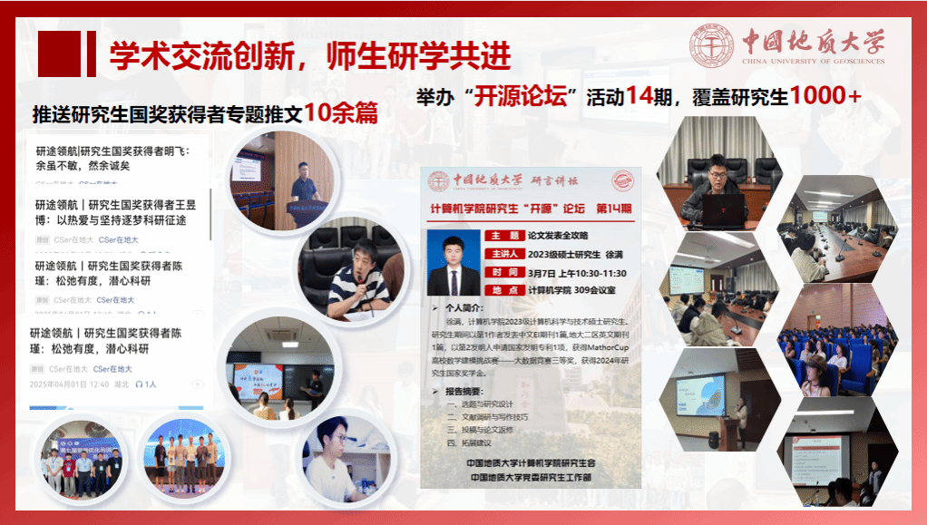 “CSer在地大”全年策划推出总推文数400+篇,总阅读数量超36万次,关注人数破万。“地大CS计小软”全年发布说说量700+篇,空间总浏览量近9万次,关注人数破千且持续增高。联动“山河网络工作室”和“后勤保障部”等制作推出《支部书记讲党史》、《新生入学劳动教育课》、《“金山杯”程序设计邀请赛》、《迎新季》、《毕业季》等系列短视频,形成“校-院-人”三级联动传播格局,有效扩大影响力。