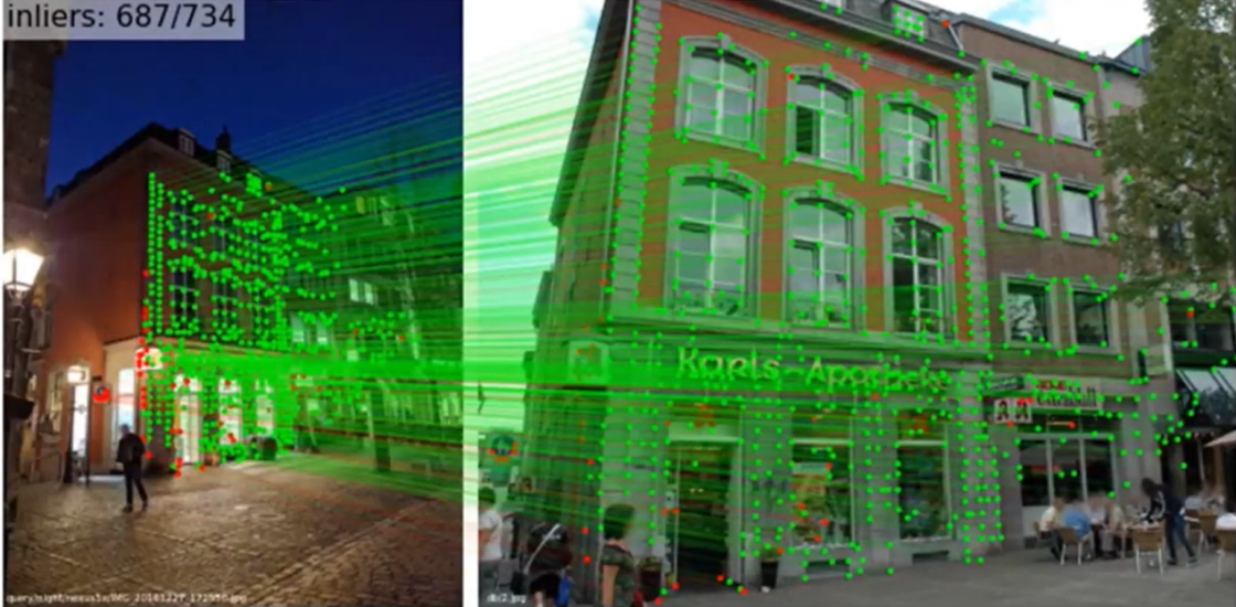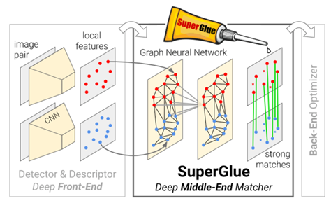 在阅读了图像匹配领域相关论文后,团队建立了SuperPoint+SuperGlue的图像匹配模型。其中,SuperPoint设计了一种自监督网络框架,能够同时提取特征点的位置以及描述子。相比于patch-based方法,提出的算法能够在原始图像提取到像素级精度的特征点的位置及其描述子。SuperGlue是一种特征匹配网络,它的输入是2张图像中特征点以及描述子(手工特征或者深度学习特征均可),输出是图像特征之间的匹配关系。相比于LoFTR和DKM,SuperPoint和SuperGlue可以让模型更好地关注图像中的重要区域,从而提高学习效果。