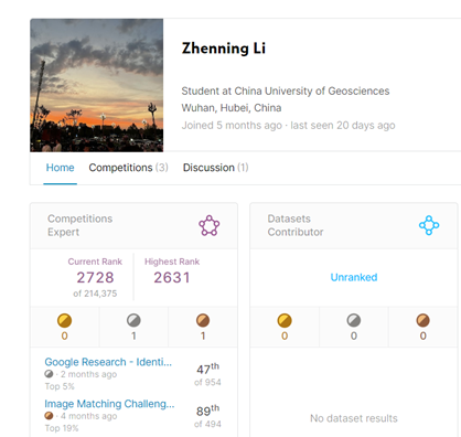 李祯宁同学共参加了kaggle竞赛的两项赛事,分别是Image Matching Challenge 2023和Google Research - Identify Contrails to Reduce Global Warming。