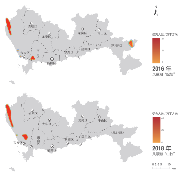 图2 2016年“妮妲”、2018年“山竹”基于受灾人口评估模型评估深圳受灾人数分布图