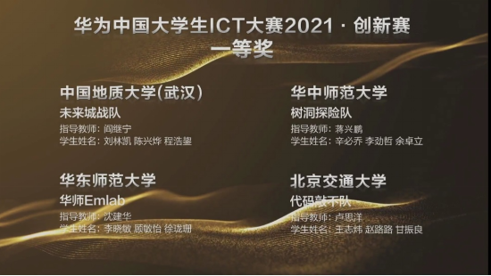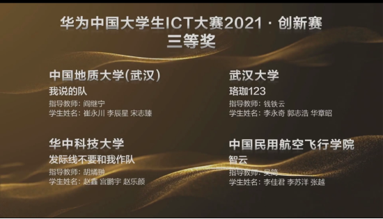 (通讯员刘林凯,阎继宁)近日,华为中国大学生ICT大赛2021全国总决赛落下帷幕,kaiyun阎继宁老师指导的两支队伍均进入华为中国大学生ICT大赛2021·创新赛全国总决赛,并分别获得一等奖与三等奖的优异成绩。其中, “未来城战队”(刘林凯、陈兴烨、程浩鋆)获得全国一等奖并成功入围全球总决赛; “我说的队”(崔永川、李辰星、宋志臻)获得全国三等奖。