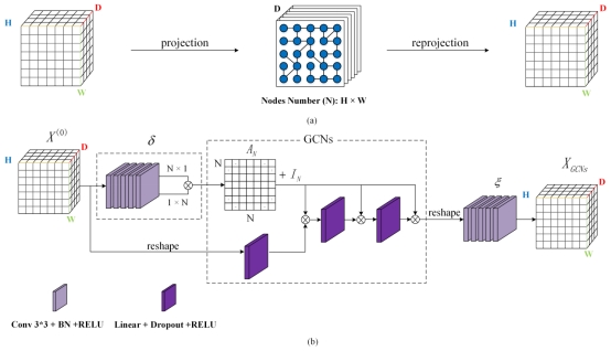 针对上述问题,本研究构建了一个矿区精细占地类型遥感智能解译框架模型(EG-UNet),该模型在增强矿山占地特征的同时,能够捕获其长距离信息。该框架包括两个主要模块:1)边缘特征增强模块。矿山占地边缘相较于空间位置,包含更关键的遥感图像敏感信息。因此,本研究在特征提取过程中,基于权重矩阵对边缘进行特征增强,进而更好地保留这些特征;2)长距离特征提取模块。构建长距离特征提取模块,有助于获取矿山占地小面积图斑特征。本研究通过图卷积网络来捕获长距离特征,并应用卷积神经网络来学习图的构造。