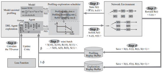 尽管系统动态事件和背景负载的变化发生的时间不确定,但长期来看通常呈现出某种规律。因此,曾德泽教授课题组综合考虑服务需求变化、物理网络特征,设计了基于深度确定性策略梯度的强化学习算法来提供智能化的在线编排。针对算法在大规模动态网络中应用时的维度爆炸问题,创新性地引入了数学模型优化方案来辅助强化学习的动作探索,设计了双重经验缓存区和多优先级经验采样策略,实现了23倍的训练速度的提升,并达到了服务的长期效用的最大化的目标。相关项研究成果已发表IEEEJournal of Selected Area in Communication、INFOCOM等顶级国际学术会议及期刊上。并获得获IEEE System Journal、ICA3PP最佳论文奖