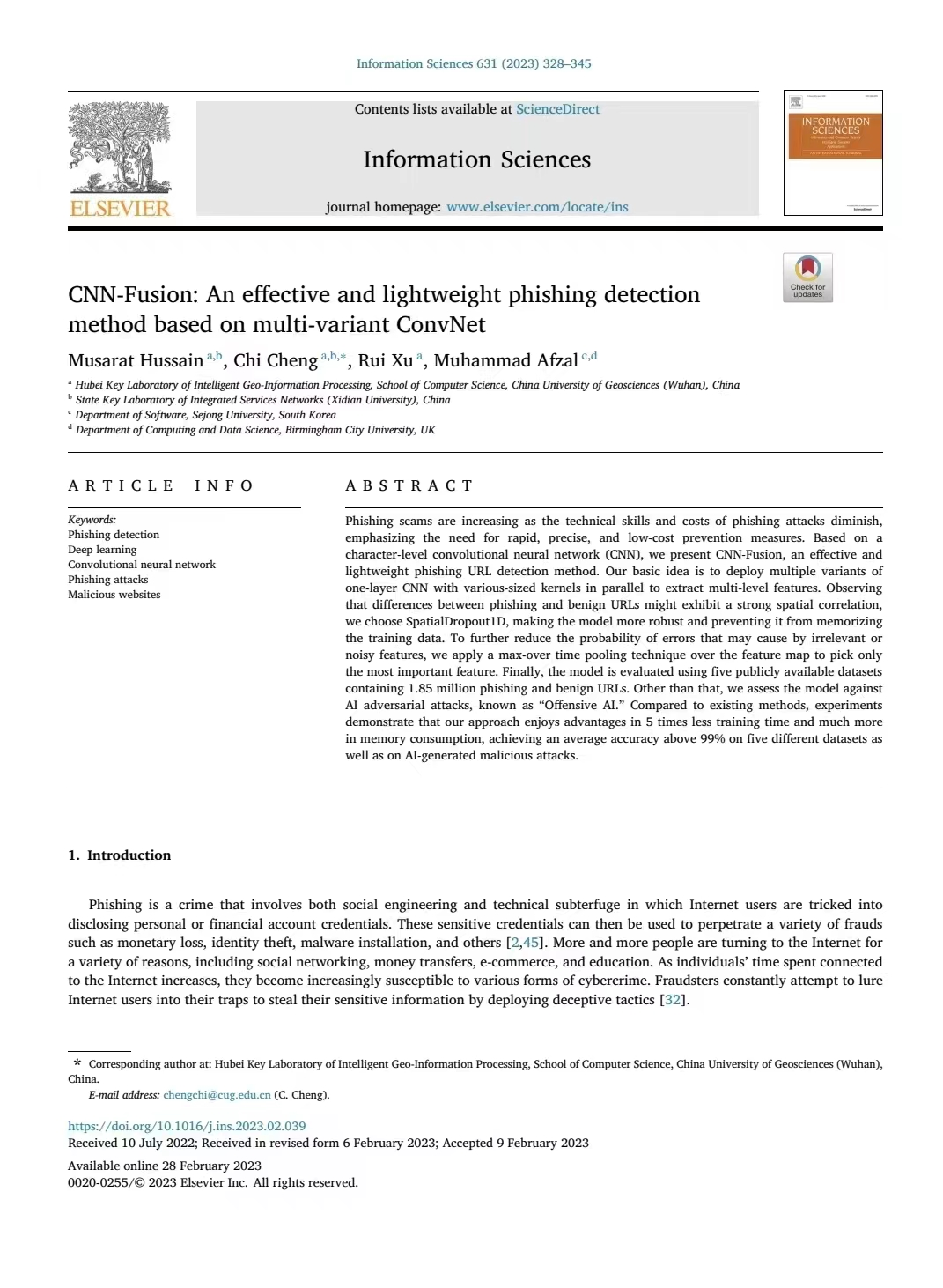 近日,我校kaiyun开云官方程池老师团队与英国伯明翰城市大学计算Muhammad Afzal教授在国际知名期刊《Information Sciences》(T1, IF=8.233)上共同发表学术论文《CNN-Fusion: "CNN-Fusion: An Effective and Lightweight Phishing Detection Method Based on Multi-Variant ConvNet"》。论文的第一作者Musarat Hussain(中文名:胡文硕)是我校2020级巴基斯坦籍硕士研究生,通讯作者是程池老师。