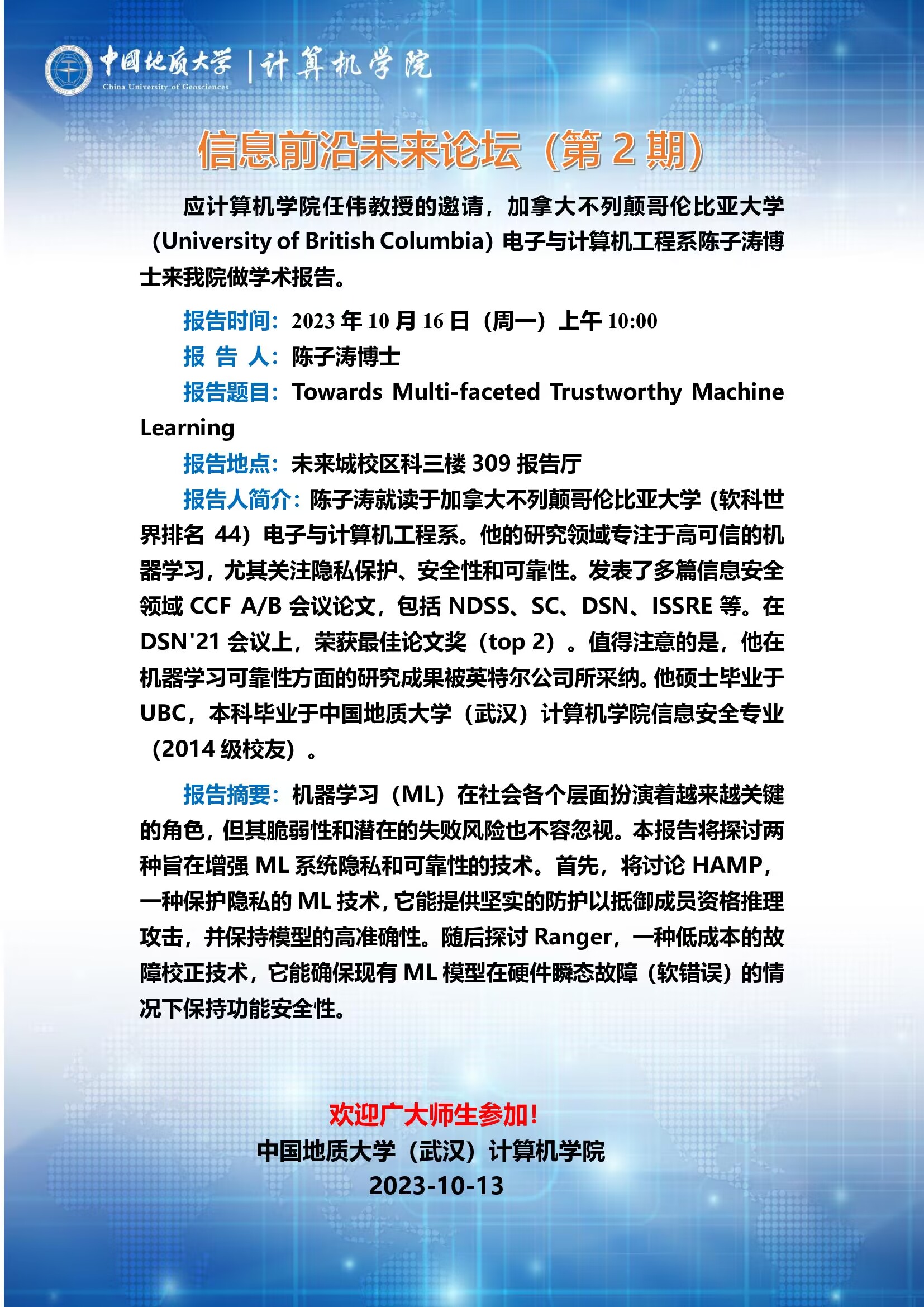 信息前沿未来论坛(第2期):加拿大不列颠哥伦比亚大学陈子涛博士——Towards Multi-faceted Trustworthy Machine Learning