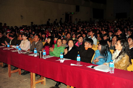 通知中心晚会邀请到了教务处杨有昌处长、园艺与园林工程系党总支唐世凯书记、畜牧兽医系党总支钱林东书记、宣传部蔡永生副部长、生物工程系团总支张梅书记、管理与信息工程系团总支黄建伟书记等领导以及云南林业职业技术学院、云南交通职业技术学院和云南医学高等专科学校三所兄弟院校的学生代表,学生工作处周诚处长、施碧强副处长、基础部李憬副主任也出席了圣诞晚会。