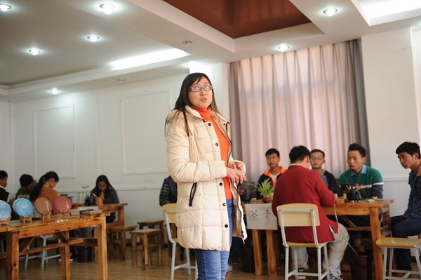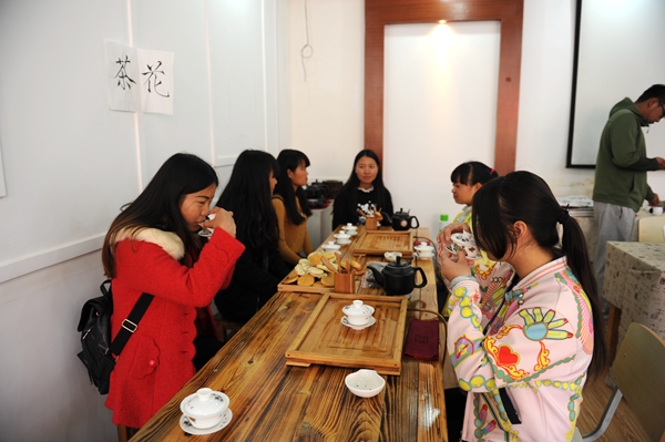 以茶会友,一杯香茗奉知已。社茶文化活动以“跨年式茶话会”为活动主题。活动伊始,大家观看表演古典舞蹈《冰菊物语》。茶艺协会副社长身着旗袍为大家表演茶艺《母爱如茶》,节目充分展示茶文化的文化底蕴,使大家对我国悠久的历史文化有一定的认识,带给观众美的熏陶和感受。茶艺协会指导教师杨净云讲解茶与人们身体健康的关系、饮茶知识及注意事项。茶艺协会社长杨鹏同学为大家作茶叶茶具展示并简单介绍茶叶茶的名称功能等,让大家对茶叶茶具有更多的了解,培养大家对茶的喜好和对茶具的珍爱。活动在“你划我猜”的游戏中画上欢乐的句号。