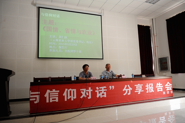 2015年5月20日中午1:00——2:30,伟德官网在小哨校区新行政楼一楼阶梯教室举行由原云南农业大学党委书记、校长黄仁跃主讲的报告会,主题为:“与信仰对话”——国情、省情与农业的分享。报告会由学校党委书记崔金赋主持。二级学院党总支书记、团总支书记、辅导员和全校团学干部近300人济济一堂聆听了报告会。