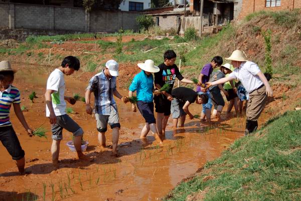 唐世凯教授向全体师生对水稻种植所涉及的土地平整、水分控制、施肥量、肥料比例、株行距、拔秧插秧、补苗等各个环节技术要点做了全面讲解示范;同时,还将132名同学分组并分别进行指导。唐教授不仅纠正了同学们不规范的技术手法,而且激发了同学们的干劲。同学们严格按照技术要求纷纷踊跃下到田间开始动手实践,稻田充满了同学们的欢笑声,洋溢着青春的活力。
