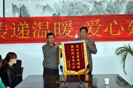陆建辉的父亲介绍了家庭情况和治疗情况,他说,对于他这种家庭承担起高昂的费用是不可能的,本来想着放弃,但那毕竟是自己的孩子。同时,在治疗的这段时间学院的领导、师生都非常关心陆建辉的病情,多次打电话慰问!在学院的有关部门的倡议下,学院发起了对陆建辉同学的爱心捐款活动,更加坚定了为儿子做手术的决心!他代表全家成员对全院师生表示感谢!陆建辉同学在医院委托班上同学表达了对学院师生的感谢,对生命、生活的热爱,表示要勇敢坚强地接受换肾治疗的挑战,尽快回到学院大家庭!随后,陆爸爸含泪接过学院的爱心善款6万元,并向学院赠与锦旗!