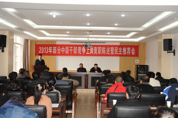 2013年元月11日上午,我院举行部分中层干部岗位竞职陈述暨民主推荐会。党委书记崔金赋、院长彭志远、党委副书记赵刚、副院长何明东、副院长赵莉、副院长俞浩等院领导,学院全体中层干部、教职工代表出席了大会。