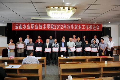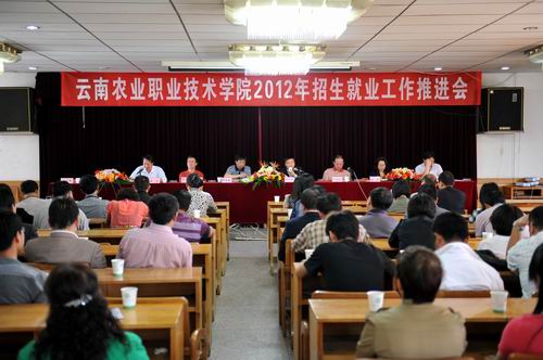 彭志远院长首先讲话,他说,今天我们隆重召开2012年招生就业工作推进会,规格比以往更高,参加的人数更多,说明全院上下高度重视,招生就业工作是关系到学院生存与发展的大事!我院自2009至2011年招生人数稳步上升, 去年突破2000人大关,取得了可喜的成绩!但我们与昆明其他示范性高职高专相比还有差距。今年我们要奋起直追,拉近与他们的距离。第二,今年招生我们要突破2300人,要通过各种措施加大招生工作的力度,请大家进言献策。下一步还要调整优化一些专业结构,要向好专业倾斜。第三,我院2011年毕业生的就业工作有新突破,签约率大幅上升,荣获省教育厅颁发的“2011年高校毕业生就业工作目标责任考核一等奖”。彭院长指出我们要把今天的会开好,进一步做好2012年的招生就业工作,使招生就业百尺竿头更进一步!