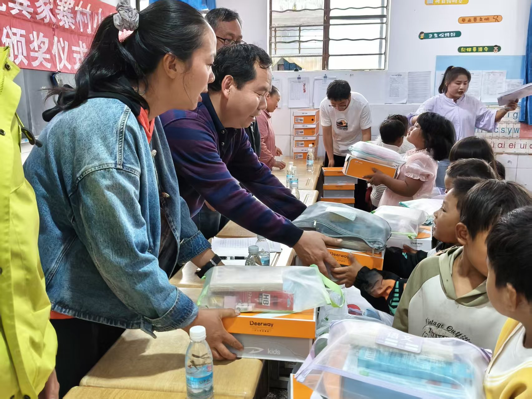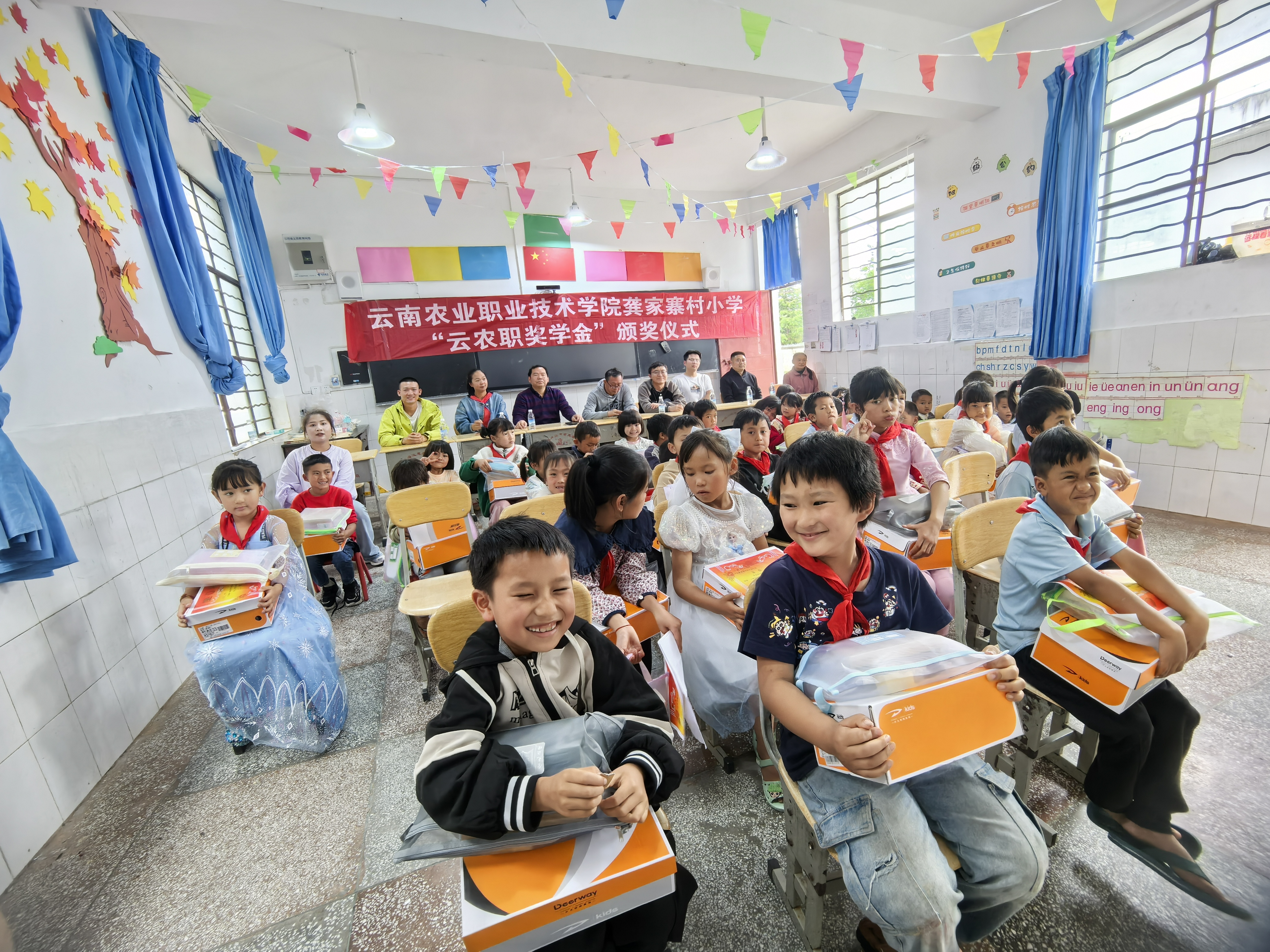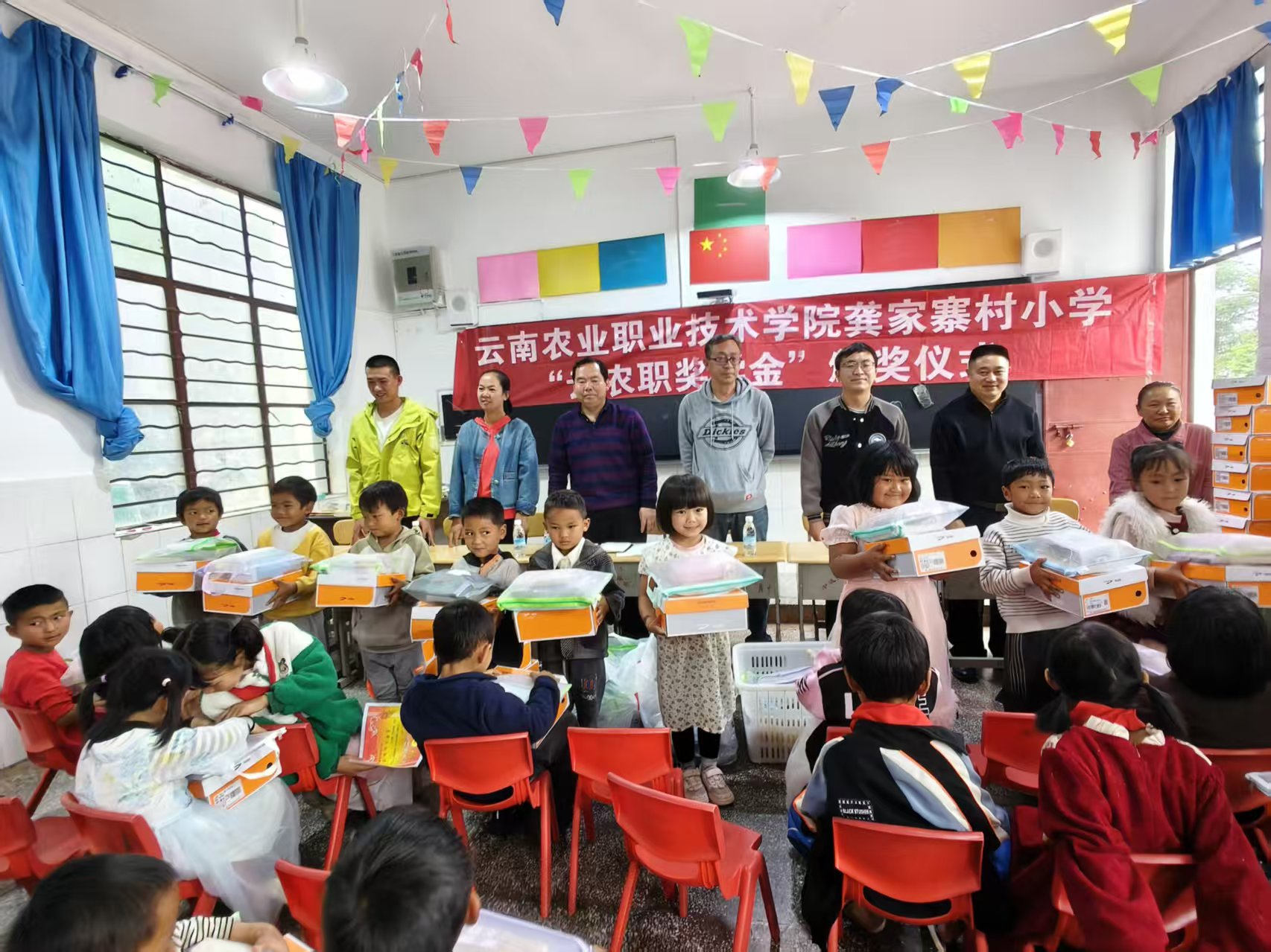 下午3时,“云农职奖学金”颁奖仪式在龚家寨小学举行。驻村工作队五位教师代表学校向获得一、二、三等奖"云农职奖学金"的同学颁发奖金,并向全体学生发放慰问品。工作队第一书记杨卫国在仪式上致辞,向龚家寨小学全体师生致以节日问候,充分肯定了该校近年发展成效,对坚守教育一线的工作者表示慰问,对此次获奖的同学表示热烈祝贺,并对同学们提出三点期许:一是做脚踏实地的"小种子",扎根乡土勤学不辍,以知识滋养理想;二是做阳光向上的"小树苗",锤炼强健体魄,培育乐观品格,勇于直面挑战;三是做心怀感恩的"小使者",铭记师长教诲与社会关爱,未来以所学回报桑梓、建设祖国。