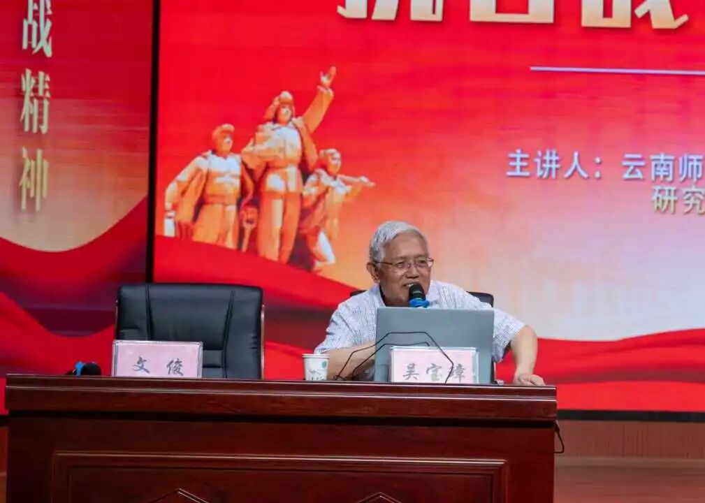 报告会上,吴宝璋教授以深厚的学术功底、生动的讲述,带大家重回烽火岁月。从“抗战输血线”滇缅公路上,民工与司机冒轰炸、战艰险的物资运输奇迹,到中国远征军从云南出征,在异国疆场用生命捍卫家国的壮烈;再到西南联大师生内迁云南,以“刚毅坚卓”精神培育人才的坚守——云南并非抗战“后方”,而是实实在在的“前线阵地”,每一个故事都让在场听众动容。