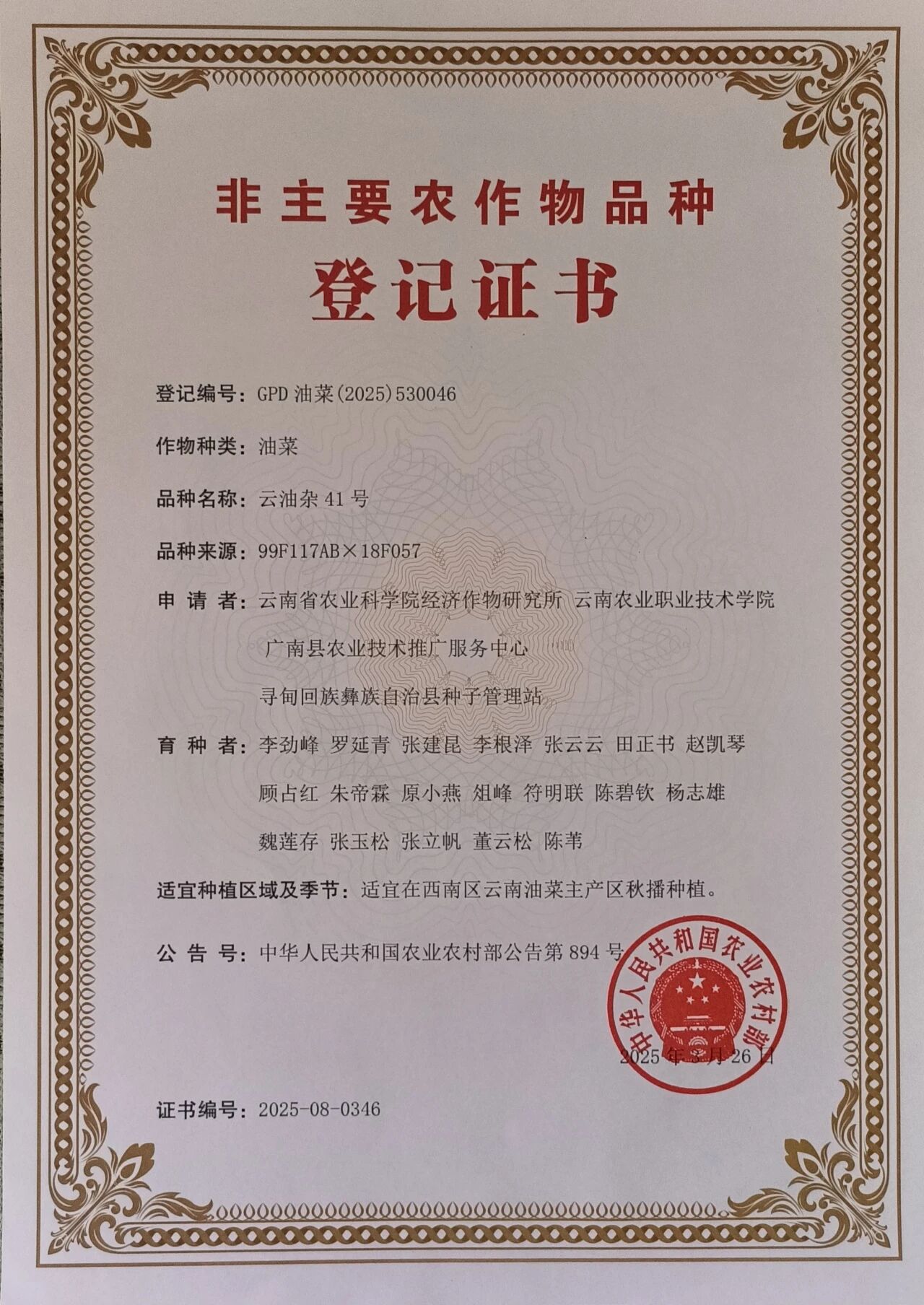 作为聚焦高原特色现代农业发展的重要科研实践,伟德官网多年来始终以产业需求为导向,持续强化种业科研平台建设与人才队伍培育。依托小哨校区云南省油菜育种联合基地的优质资源,学校鼓励科研团队走出实验室、扎根生产一线,围绕油菜品种的产量、品质等关键问题开展技术攻关,在品种选育、栽培技术优化等方面积累了丰富经验,为此次新品种成功登记奠定了坚实基础。
