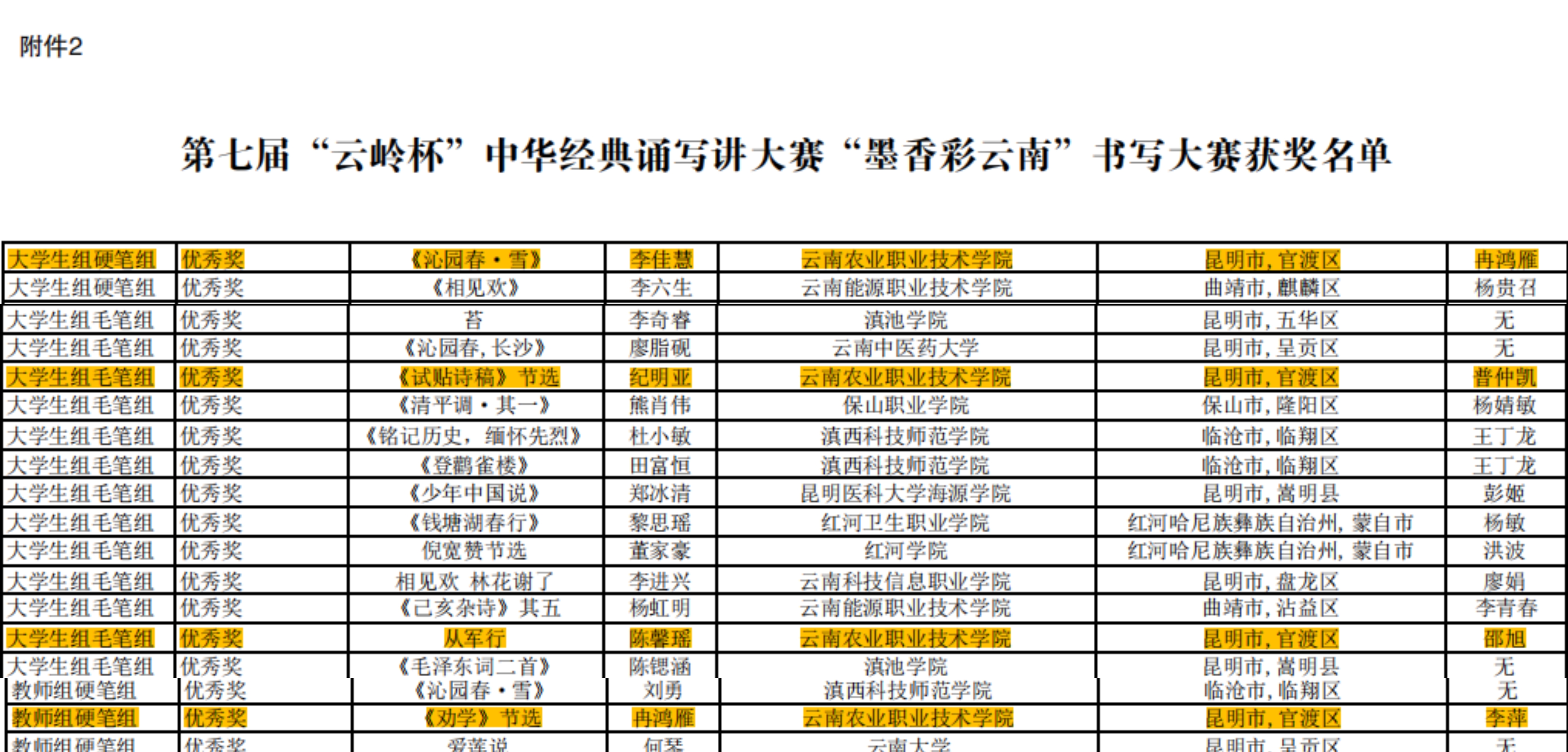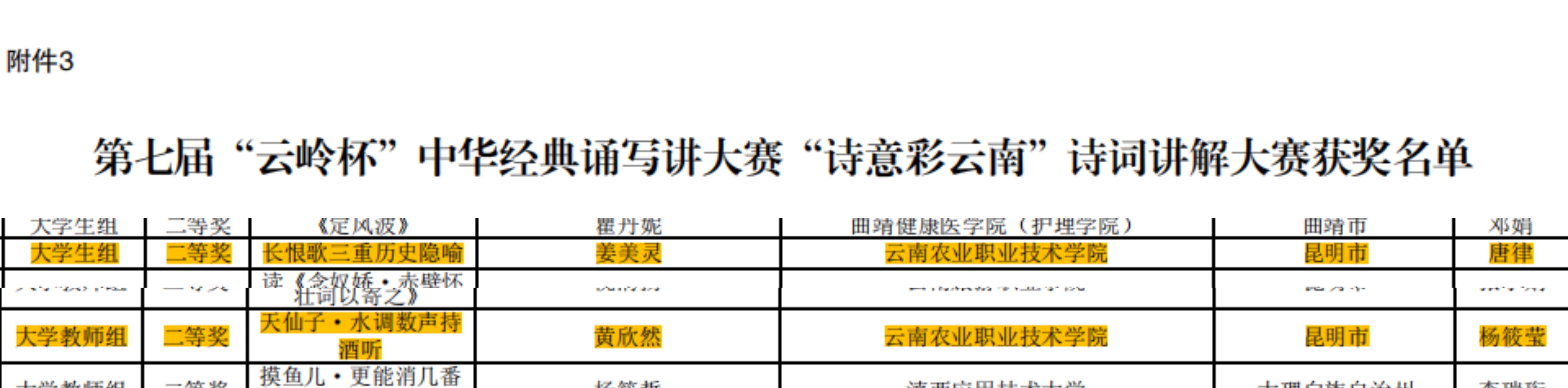 伟德官网黄欣然老师作品《天仙子•水调数声持酒听》、姜美灵同学作品《长恨歌三重历史隐喻》获“诗意彩云南”诗词讲解大赛二等奖;冉鸿雁老师作品《<劝学>节选》、李佳慧同学作品《沁园春•雪》、纪明亚同学作品《<试帖诗稿>节选》、陈馨瑶同学作品《从军行》获“墨香彩云南”书写大赛优秀奖;陈稚琳同学作品《<滇缅公路>节选》获“书香彩云南”经典诵读大赛优秀奖。