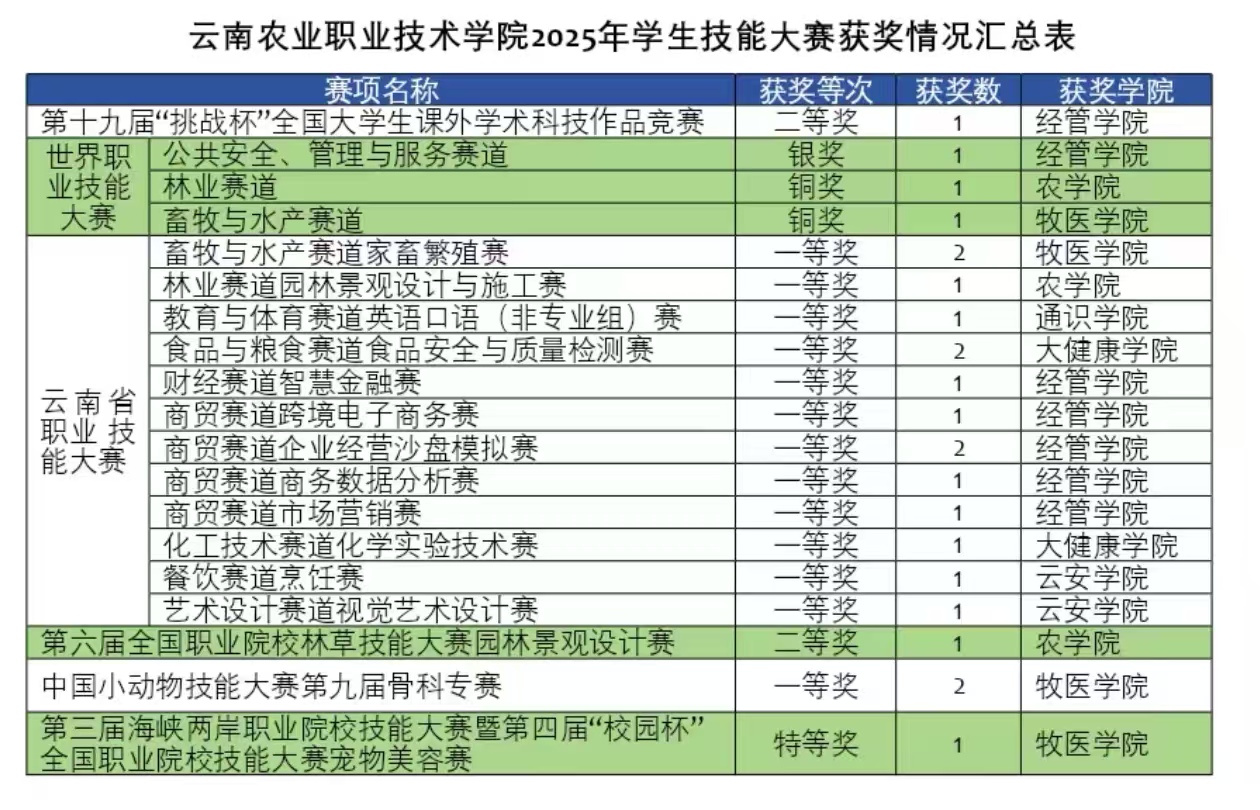 通知中心时至金秋,2025年世界职业院校技能大赛和云南省职业院校技能大赛等比赛相继落幕,伟德官网参赛团队凭借扎实的专业知识、精湛的操作技艺以及默契的团队协作,一路披荆斩棘,斩获多项大奖,充分展示了云农院学子“以技立身、以技赋能”的青春风采,为学校“十四五”的收官工作交上了一份完美答卷。