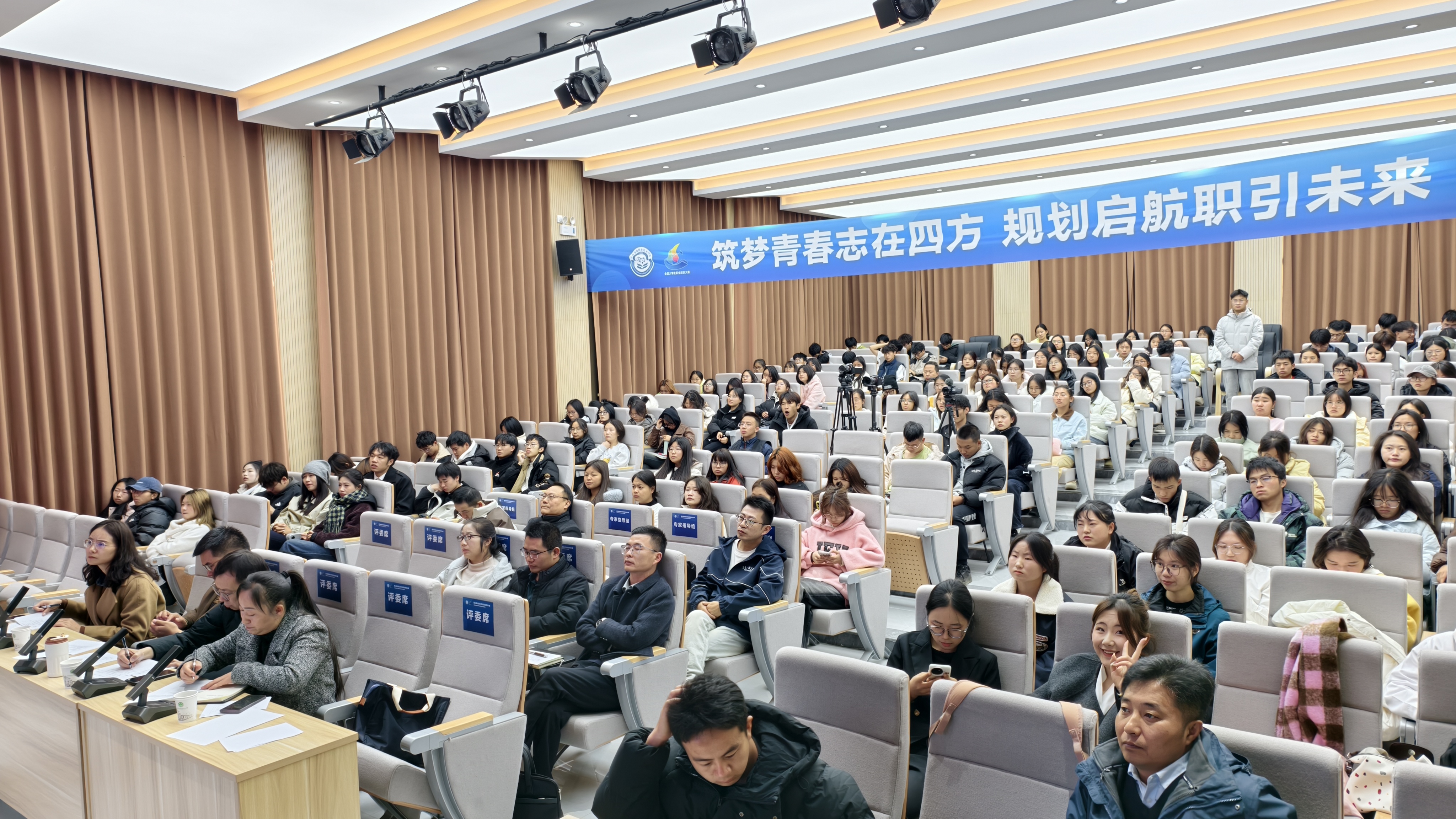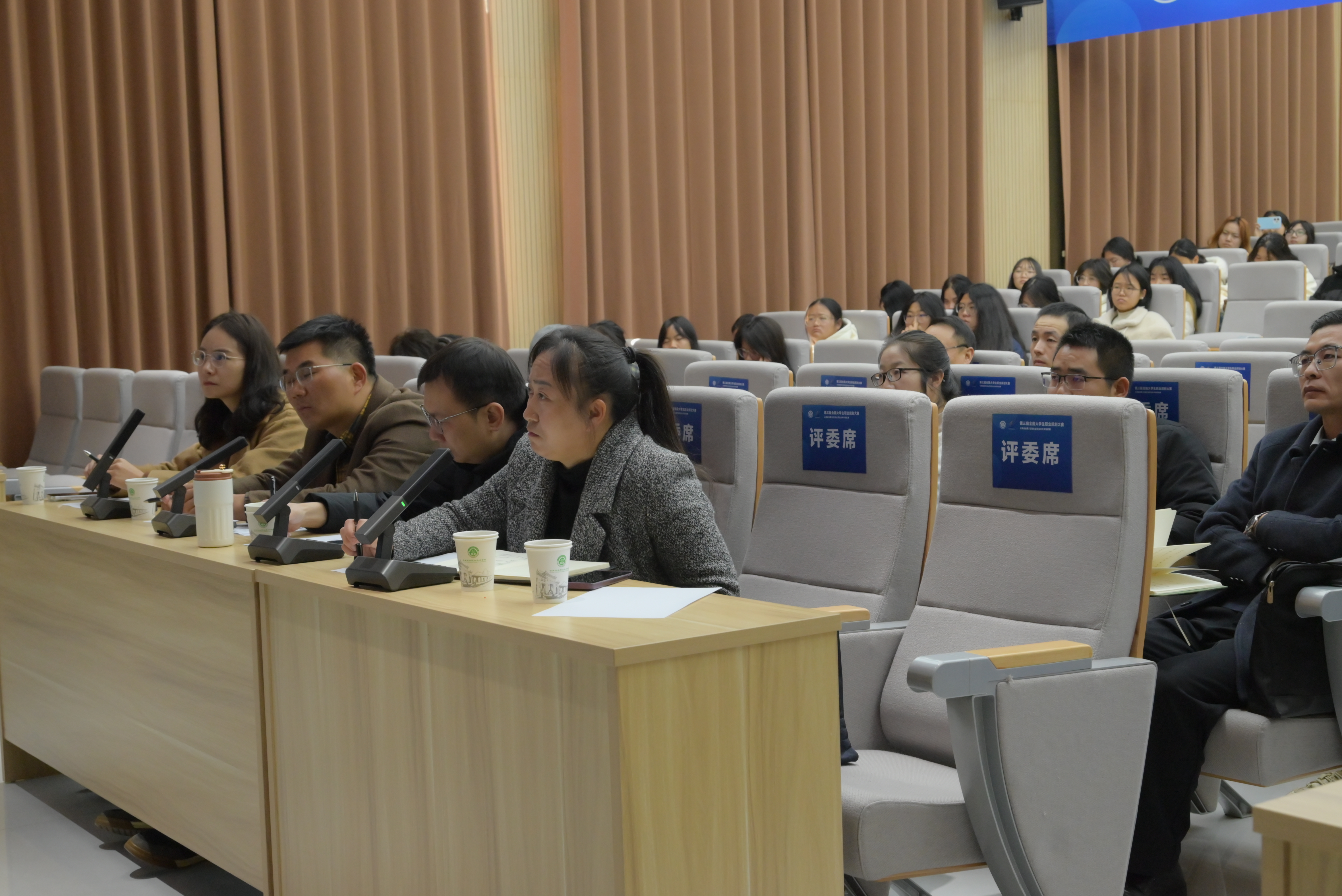 评审环节组建了权威评委团,由4名高校职业规划专家与3名企业人力资源总监组成,从规划科学性、岗位适配度、专业匹配度等维度进行综合考评。教指委专家全程莅临指导,15名志愿者组成的工作团队保障了赛事高效运转,学校副校长盛冀萍、招就处处长徐贤明和副处长韩卫明及各二级学院指导教师出席活动。