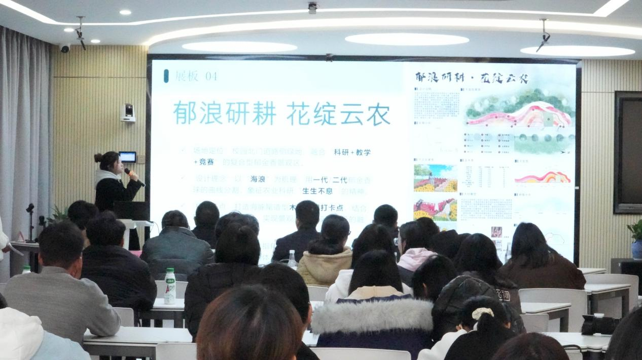 汇报环节中,各团队通过生动演示与清晰讲解,全方位呈现设计巧思——从花海整体布局到郁金香品种搭配,从生态理念融入到实用功能考量,充分彰显学子们的专业素养与创新思维。评审团由吴学尉教授、李平总经理、邓宏林高级工程师三位校外专家,及罗瑞芳、李霏飞、赵婧竞、杨国静四位校内教师组成,秉持公平公正专业原则,对各方案细致点评、精准打分。吴学尉教授在汇报结束后作总结指导,提出针对性优化建议,为方案完善提供有力支撑。