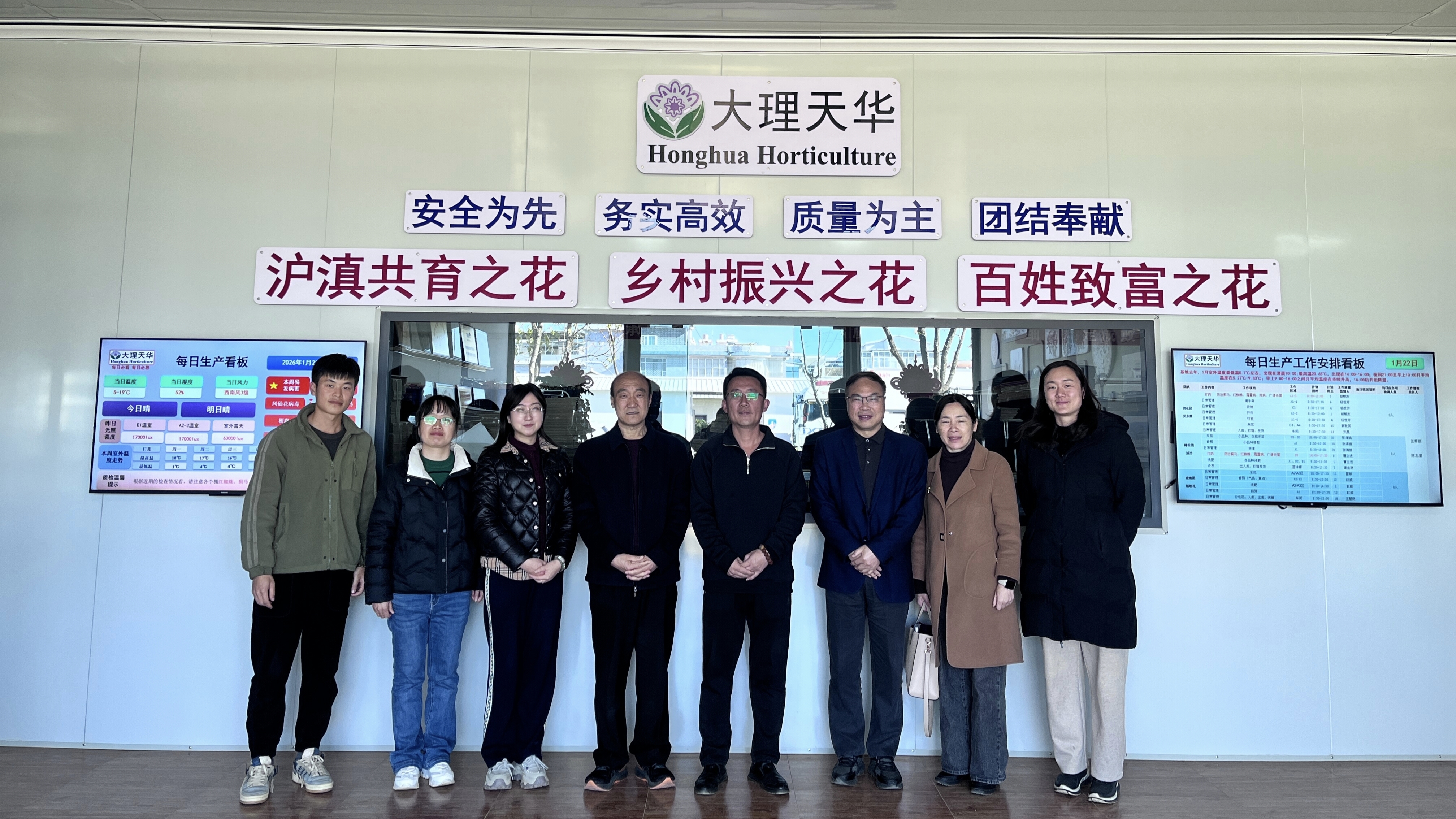 1月22日,调研组赴大理天华生物农业有限公司调研,受到了公司陈志星总经理的热情接待。作为沪滇协作重点项目承载企业,天华公司构建了从种苗研发到市场销售的完整花卉产业集群,在菊花、玫瑰、郁金香等品类种植中的分级标准、田间管理规范具有显著优势。调研聚焦种苗培育、生产种植、分级采收等核心岗位,详细调研企业精细化管理模式与标准化生产流程。双方就花卉种植岗位技能要求、人才评价标准等达成共识,计划将企业成熟的岗位操作流程、品质分级规范转化为标准化教学内容,同步融入工作手册式教材中。