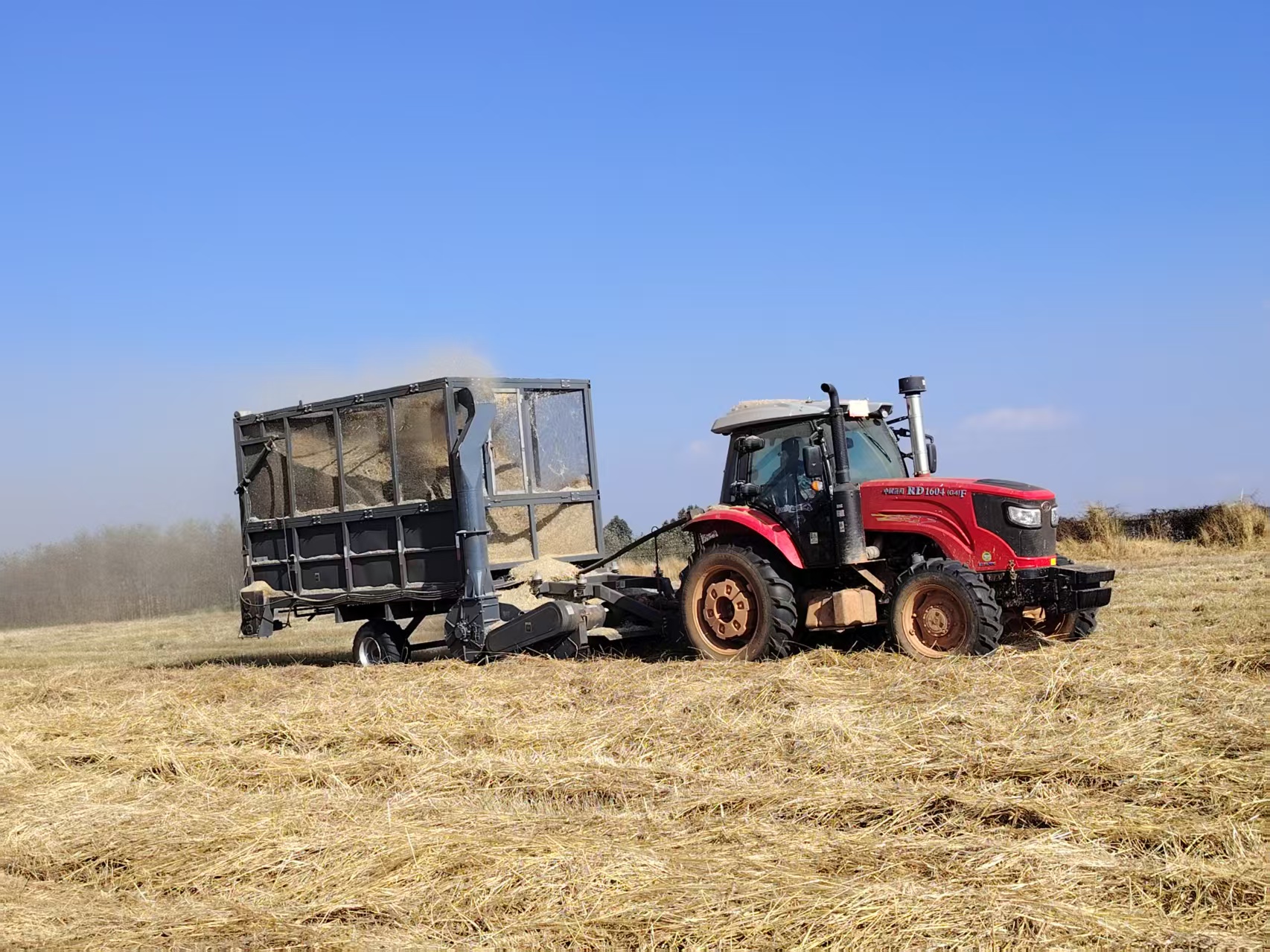 冬闲人不闲,草垛满库房。2025年12月正值冬季青干草收割的关键时期,我校种畜技术研发中心种牛基地的草场里一片繁忙景象。2025年5月新购置的秸秆捡拾回收车及配套1604拖拉机马力全开,在草场来回穿梭,将原本翻、捆、捡、装、运、卸、解、碎的八个工序“一站式”完成,不仅大幅提升了青干草收割的作业效率,更省下了捆草绳材料费、翻草捆草油料费、人工工时费以及粉碎草料的电费等多项开支,为种牛培育工作实现降本增效目标奠定了坚实基础。