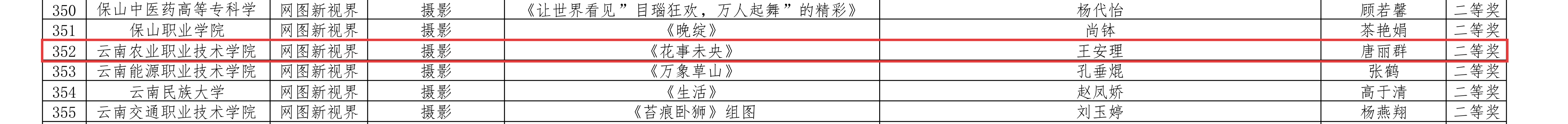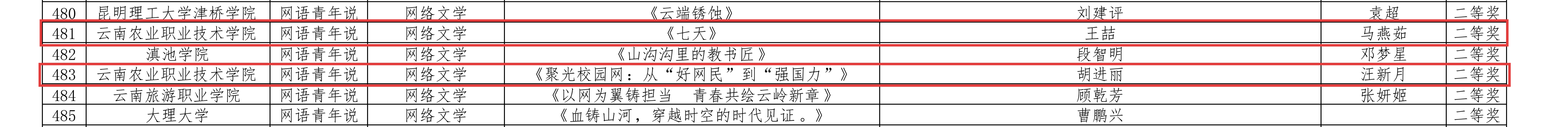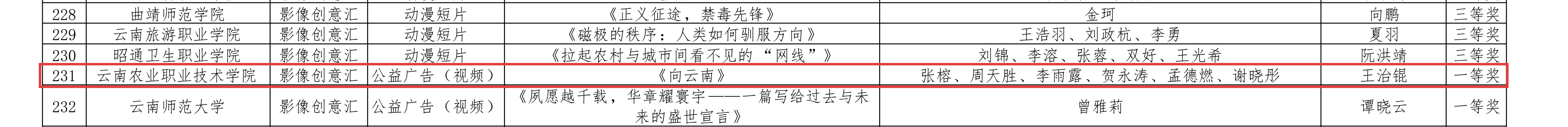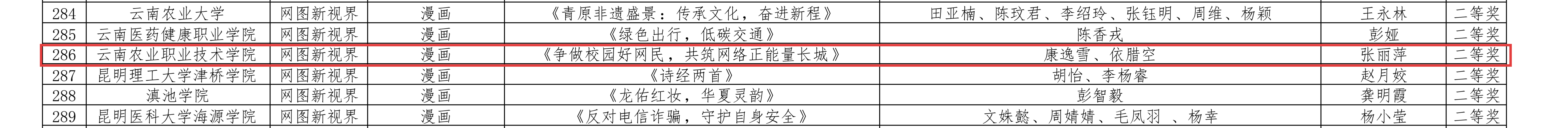在第八届云南省大学生网络文化节作品学生组比赛中获奖作品共计15件。光影趣青春板块,刘文瑞、许秋萍等同学的微课程《民族茶宴石榴红》获一等奖,王安理、罗忠涛等同学创作的微视频《脚印落在乡村振兴的路上》获二等奖。影像创意汇赛场,张榕、周天胜等同学创作的公益广告(视频)《向云南》摘得一等奖。网图新视界板块,娄云刚同学创作的平面广告《科技创新生》获一等奖;康逸雪、依腊空等同学创作的漫画《争做校园好网民,共筑网络正能量长城》,王安理同学创作的摄影作品《花事未央》均获二等奖。网语青年说板块,张宇墨同学的网络文章《当Z世代用网感解构宇宙 ——一场横跨虚拟与现实的星空狂欢》获一等奖,贾若鱼同学的《别让“收藏夹”成为学习终点:大学生网络学习避坑指南》获三等奖;网络文学赛道中,王喆同学的《七天》、胡进丽同学的《聚光校园网:从“好网民”到“强国力”》均获二等奖。校园好声音板块,沙春蕊同学的校园歌曲作品《网聚微光,燃向远方》、王裕盈同学的《还有梦想(热血逐梦版)改编歌曲》均获三等奖。网创梦工厂板块,李金峰同学的微信推文《耕道养德青春志 网聚能量新征程》、胡慧同学的表情包《农耕小剧场》、曾卉同学的《霸气小猫不开心》均获三等奖。